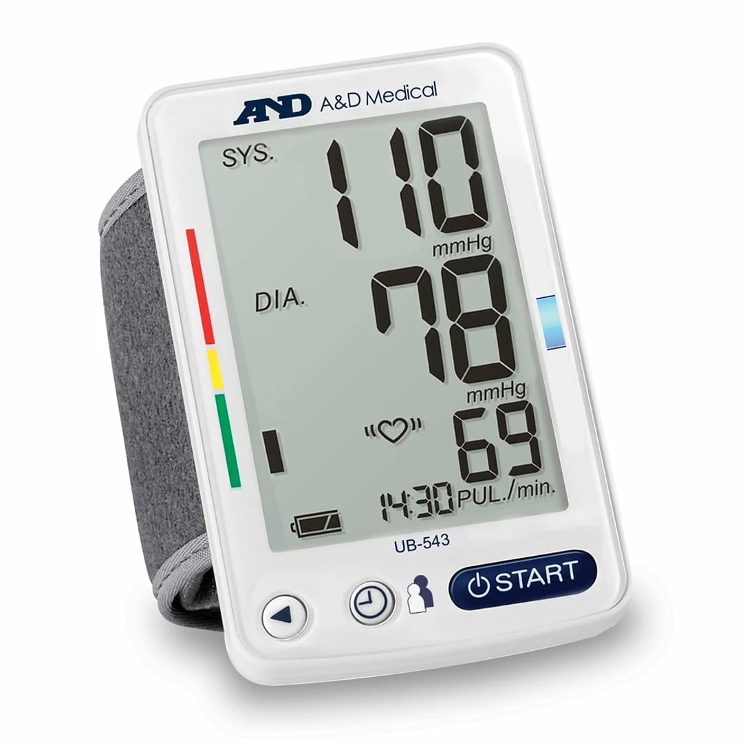 UB-543 wrist monitor featuring correct positioning guide ensuring accurate results, clinically validated for accuracy, dual user option, extra-large LCD display, pressure rating indicator, irregular heartbeat detection, 60 memory recall per user, time and date stamp for every reading, averaging functionality.