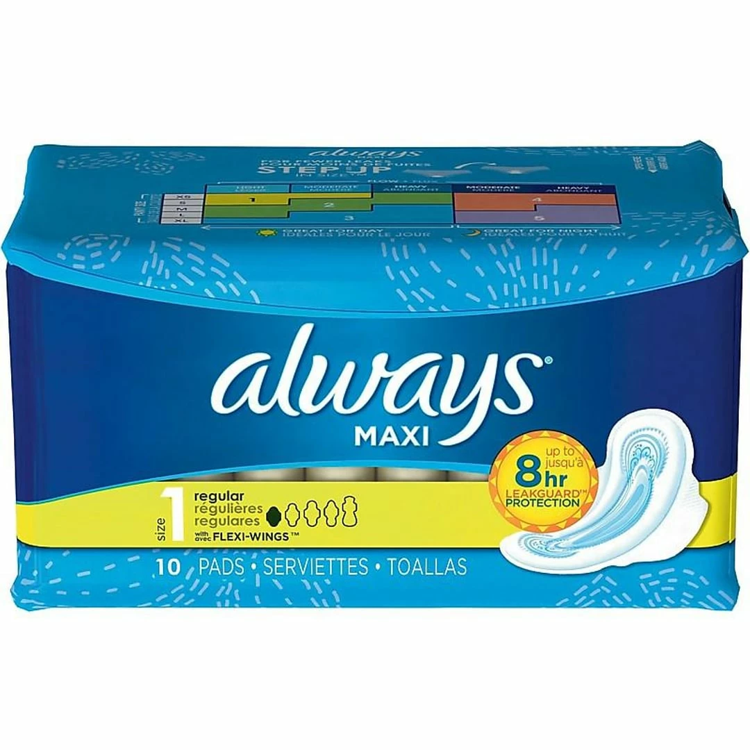 Keep your clothes protected day and night with these 120-count Always Maxi regular pads with wings.