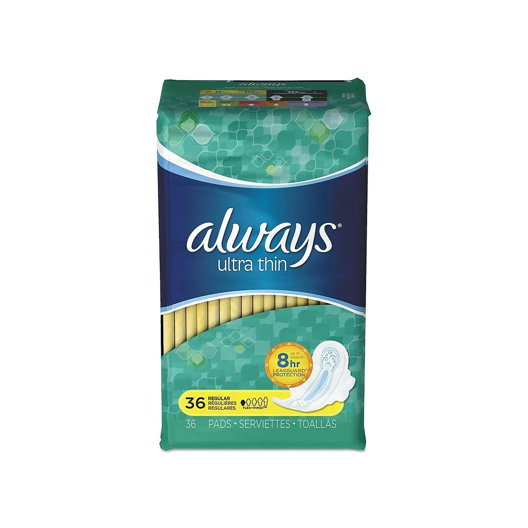 Keep guests and employees comfortable by supplying these highly absorbent menstrual pads. These pads offer up to eight hours of LeakGuard protection, strengthened by a core that pulls moisture in to protect clothing. Each carton in this 6-pack contains 36 winged Always ultra-thin pads perfect for stocking restrooms in restaurants, lobbies, and offices.
