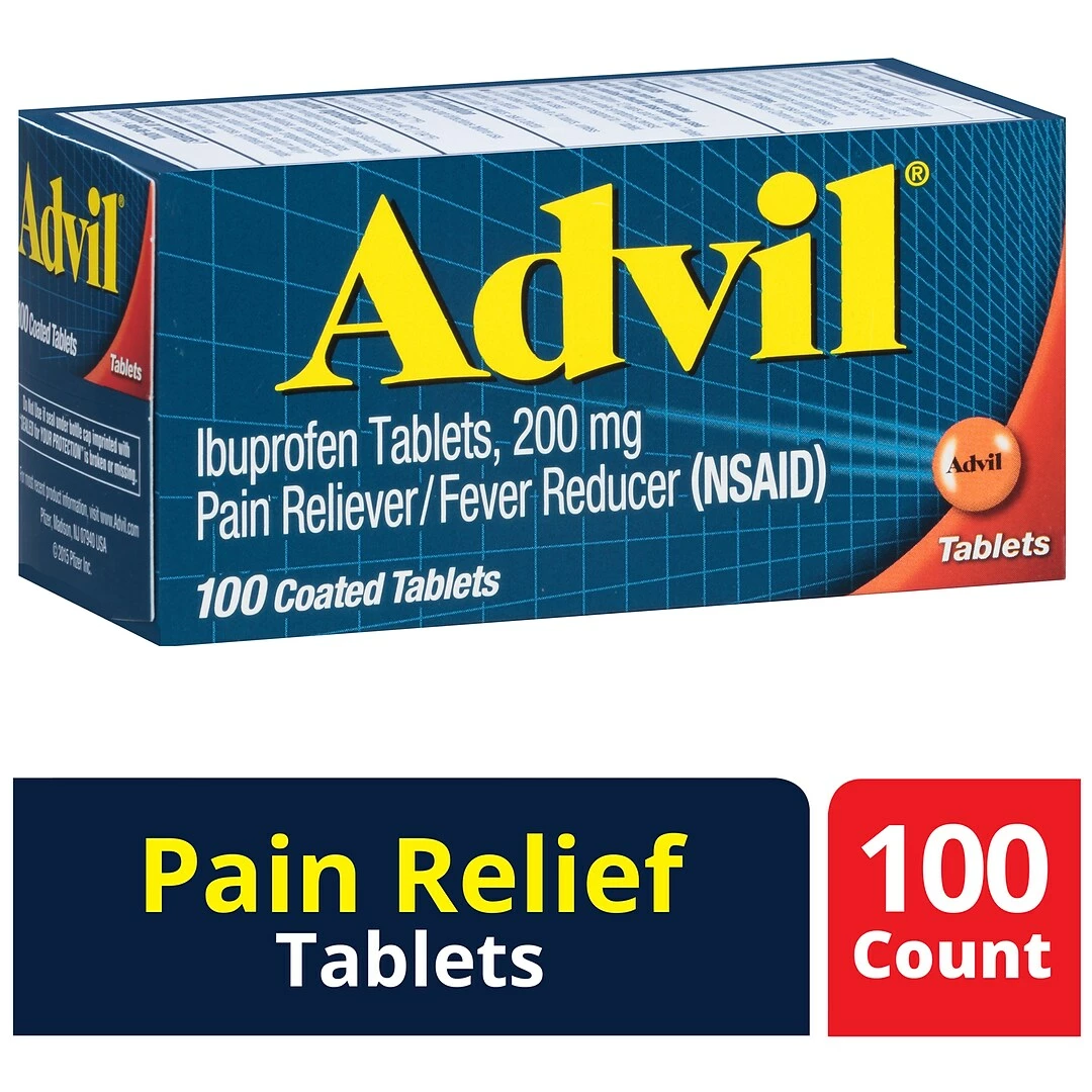 One bottle of 100 Advil Pain Reliever and Fever Reducer coated tablets, with ibuprofen 200mg for pain relief