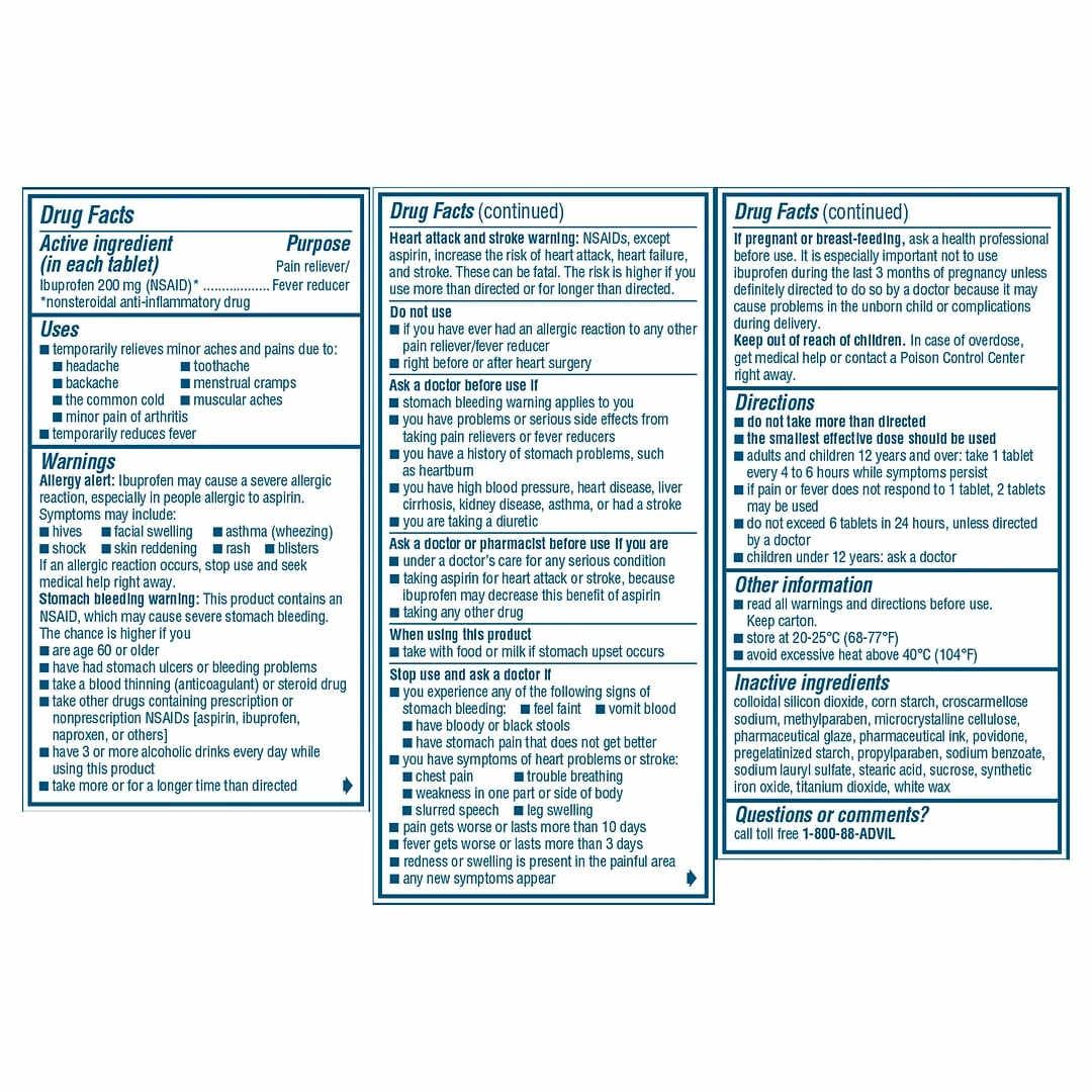 This pain medicine and fever reducer is scientifically designed to block the chemicals in the body that cause pain and fever. Each tablet contains ibuprofen 200mg, a non-steroidal anti-inflammatory drug (NSAID). Coated Advil tablets are easy to swallow, providing relief that lasts for up to 6 hours. One Advil is all it often takes for headache relief, muscle ache relief, joint pain relief or minor arthritis pain relief, and the medicine in Advil is what doctors use most for their own aches and pains. The world’s best-selling ibuprofen brand, Advil has provided safe, effective pain relief for over 35 years. Nothing’s stronger on tough pain than Advil. (1) (1) Among non-prescription analgesics