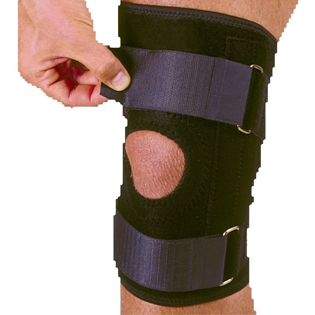 Bilt-Rite Mutual Neoprene Knee Stabilizer with Strap comes with extra dual straps with hook & loop fasteners for additional compression. It features a reinforced padded patella and is available in black.