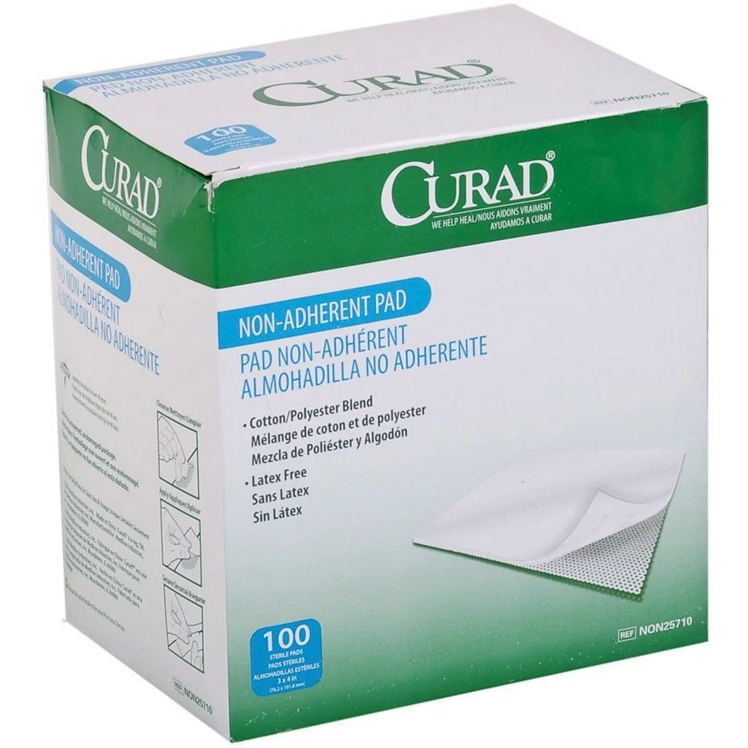 The Curad non adherent pad is sterile, absorbent rayon/polyester pad will not interfere with granulating tissue by sticking to the wound. The soft perforated film of the non adherent sterile pads allows air to circulate and the absorbent pad allows the fluid to collect.