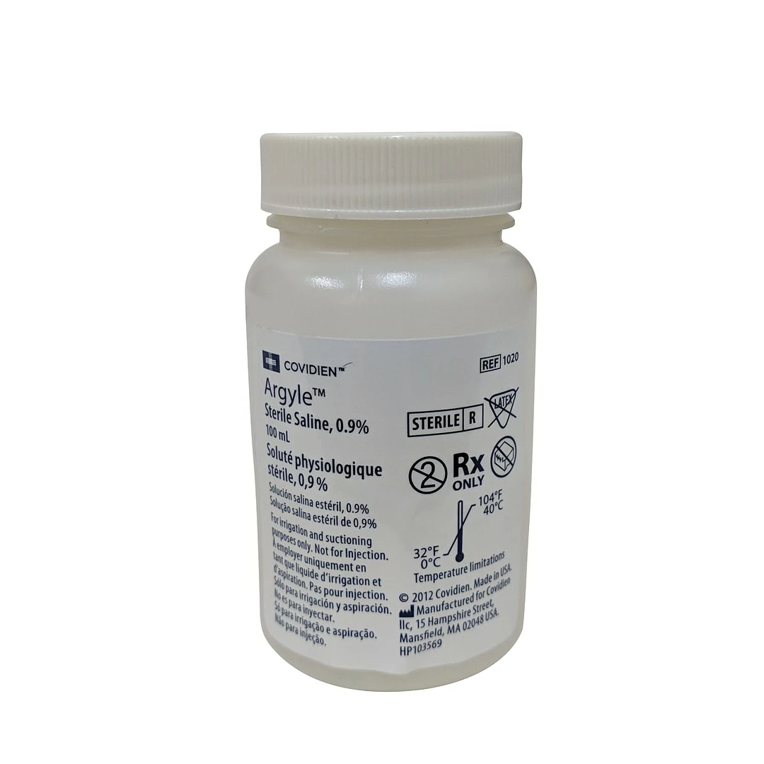 Covidien Argyle Sterile Saline Solution provides sterile irrigation and is available in 6/box. It is made with 0.9% sodium chloride and can be used for suctioning purposes.