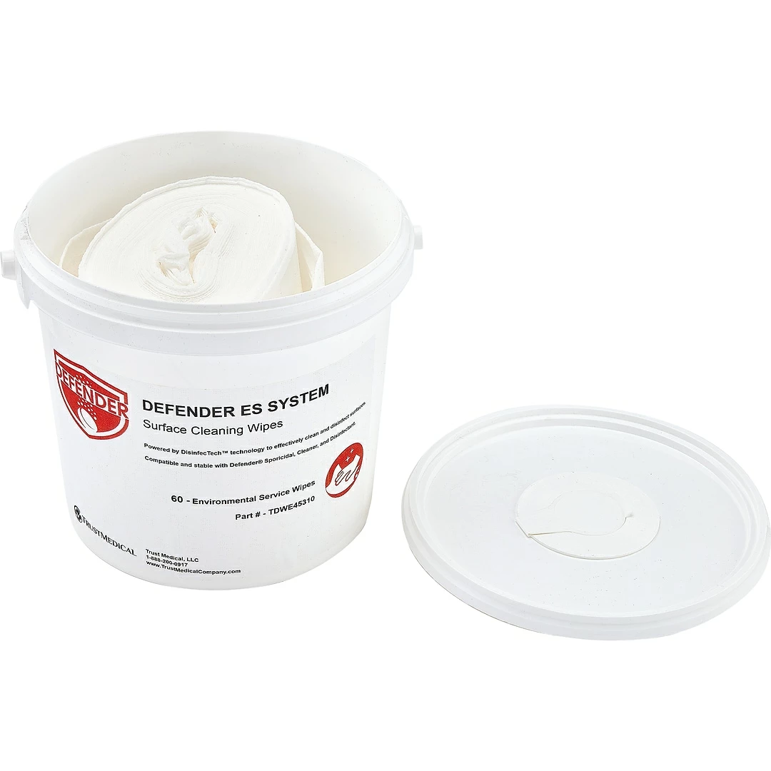 The Defender ES wipe assembly includes one plastic bucket with lid, one dry wipe roll (60 wipes per roll), and one transfer label. The bucket features a flip top opening in the lid to dispense wipes. The transfer label is specific to the Defender solution. All items come packaged in one box. Everything needed to be able to use the product (also compatible with other cleaning solutions) in a wipe form. Simply pour the solution over the wipes, and it creates a wet wipe disinfectant option for any product.