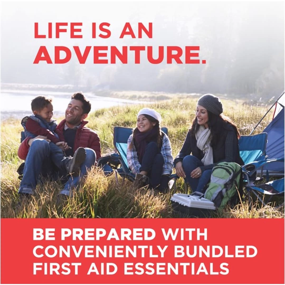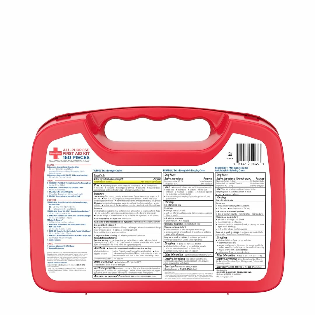 160-piece Johnson & Johnson All-Purpose Portable Emergency First Aid Kit is ideal for home, in cars, outdoors, dorm rooms, & while camping, cooking or on-the-go to help care for minor cuts, scrapes, burns, itches, pain, skin rashes & insect bites