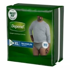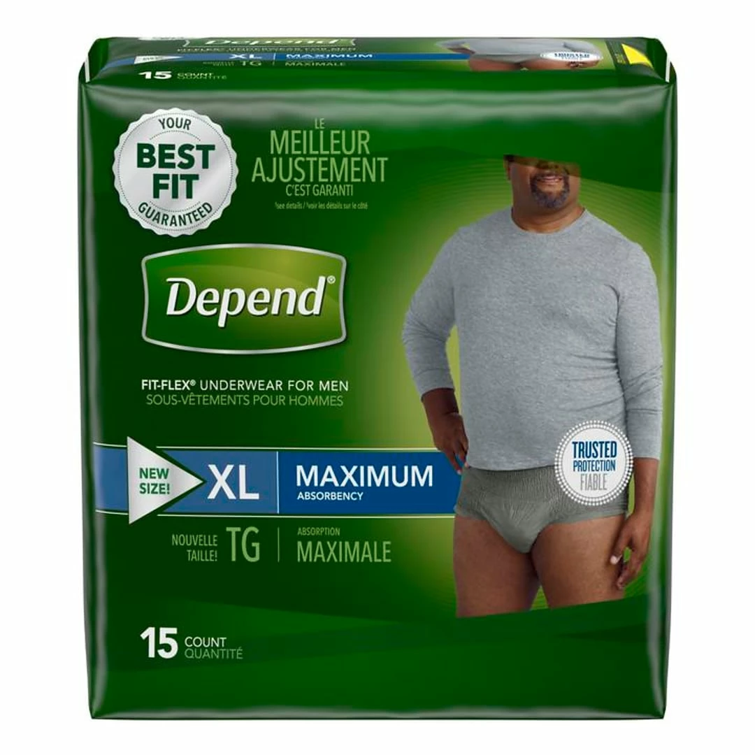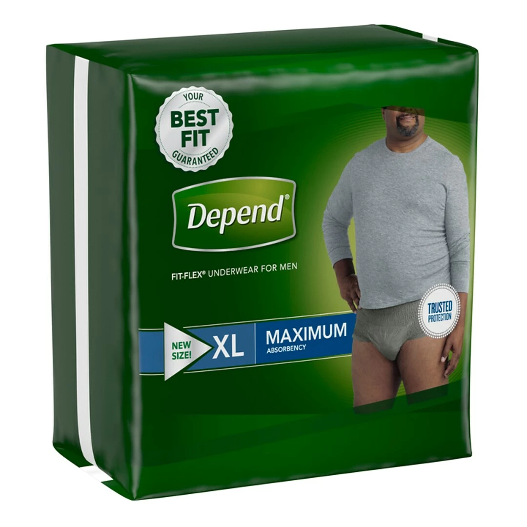 Reclaim and reconnect with what matters most in your life in the new and improved Depend FIT-FLEX Incontinence Underwear for Men. Now in more sizes for better comfort, Depend disposable underwear feature Confidence Core Technology – our fastest absorbing material – to instantly absorb wetness for dry, comfortable protection. Drawing wetness away from the skin, the thin, contoured pad locks in urine and odors. Snug, brief-like leg openings have all-around elastics for a close-to-body fit – just step in and pull on. And with the improved waistband for added security, Depend FIT-FLEX for Men provide an underwear-like fit. Depend incontinence underwear are soft, quiet, breathable and discreet, and the natural fit is more flexible† to move with you. Depend incontinence underwear for men are latex-free, lotion-free, fragrance-free, and come in a neutral gray color. Depend for men are eligible for purchase with a Flexible Spending Account (FSA) – applicable in the U.S. only. Size extra large fits men with a 44-64-inch waist and who weigh 200-300 lbs. †vs. leading bargain brand