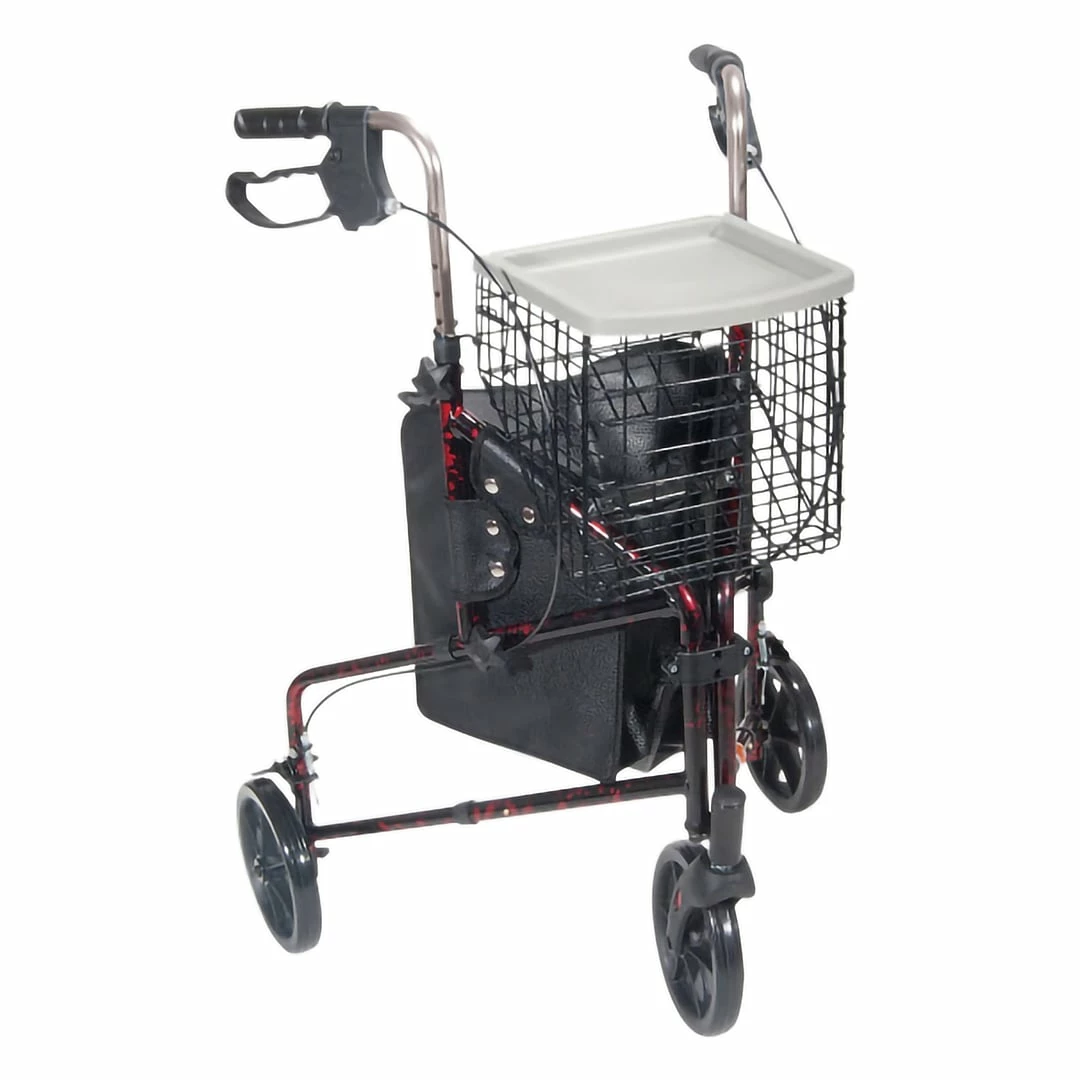 This 3 wheel rollator in blue has a lightweight aluminum frame and comes standard with basket, tray and pouch. Easy one hand folding makes for simple storage. Easy to adjust handle height with self-threading knob. Lightweight solid 8″ wheels for indoor and outdoor use. Comes standard with special loop locks made of internal aluminum casting to ensure safety.