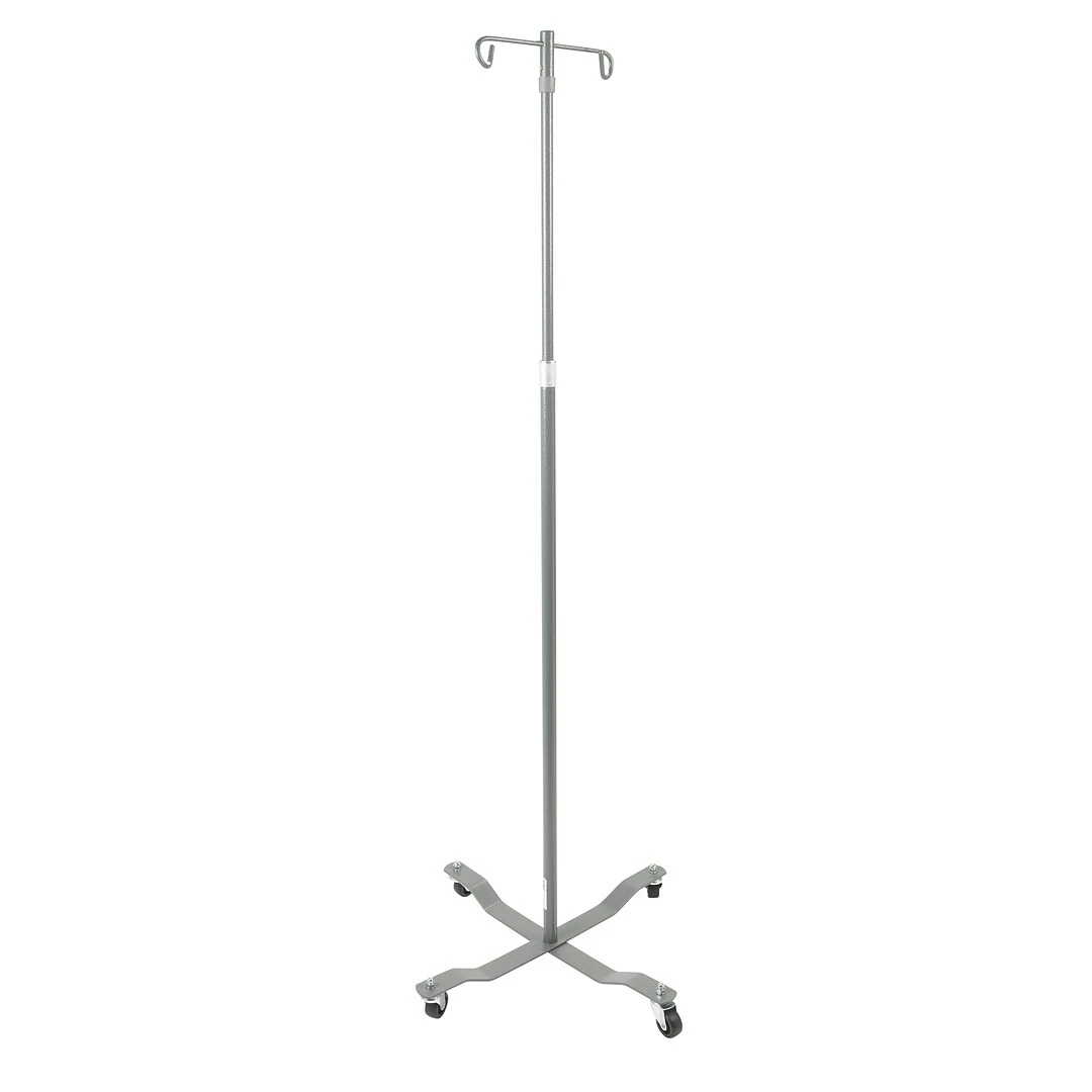 Removable hooks on this economy 4 hook IV pole (in chrome) by Drive Medical speak to its versatility. With easy push-pin release, it converts between a 2-hook and 4-hook top. (Product is available in 2-hook and 4-hook form.) Chrome-plated steel with weighted base provides strength and durability, while, most importantly, reducing the risk of tipping. A locking collar allows for simple height adjustment to the stem and four rubber wheels ensure smooth transportation and maneuverability.