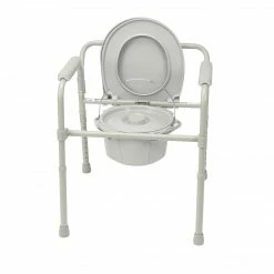 The Drive Medical Folding Steel Bedside Commode easily opens and folds, and will fold flat for convenient storage and transportation. The easy to use snap buttons allows this commode to open and fold in seconds. The durable plastic snap on seat and lid with the grey powder coated steel welded construction increase strength and durability. It comes with plastic arms for added comfort and safety. Comes complete with 7.5 qt commode bucket with carry handle, cover and splash shield.