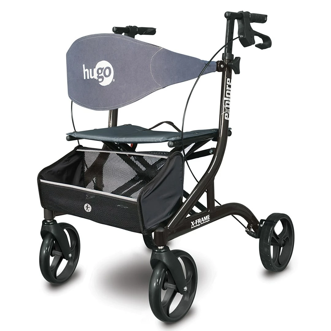 At just 15.4 lbs (not including bag and accessories of appx. 2 lbs), the Hugo Explore Rollator weighs up to 20 percent less than the competition while still providing peace of mind with industry leading stability. This lightweight rollator features a padded built-in seat and Full-fit contoured backrest that provides a comfortable place to sit and rest. For added safety, the hand brakes conveniently lock while sitting down.The Explore’s side-folding frame design conveniently folds up by just a pull of the strap located on the seat and then stands independently when folded. A convenient storage basket provides security for your valuables and easily folds closed together with the walker. These rollators have height adjustable handle bars for proper posture and ergonomic hand grips which place your hands at a natural angle for comfort and better brake access. The easy assembly makes this rolling walker quick and simple to set up, folds down into a compact size for storage and easily fits into most car trunks. Hugo Explore Rolling Walkers are designed to support adults up to 300 lbs, securely lock in open position and have reflective trim for added visibility in the dark. This rollator walker is well suited for those rehabilitating an injury, dealing with severe arthritis or those who have conditions that compromise their balance. With 8 inch treaded rear wheels, the Explore Side-Fold Rollator gives you reliable stability for more confidence and security when walking indoors or outdoors.
