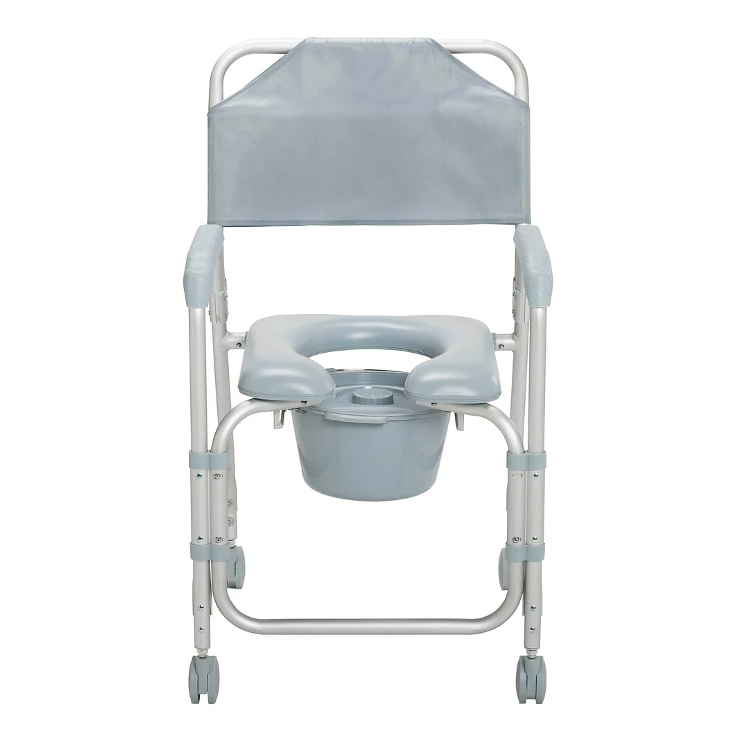 This lightweight portable shower chair commode with casters by Drive Medical is packed with features to ensure a pleasant and comfortable bathing experience. One of the greatest benefits is the ultra comfort padded seat, featuring an open front design making personal hygiene easy and convenient. When the shower chair is not in use the back and 12 quart commode bucket can be removed without tools making cleaning and storage simple. The frame is manufactured with lightweight rust resistant anodized aluminum. Easy to operate this shower chair commode comes equipped with 3″ non skid casters making transfer too an from any bathroom safe and secure.