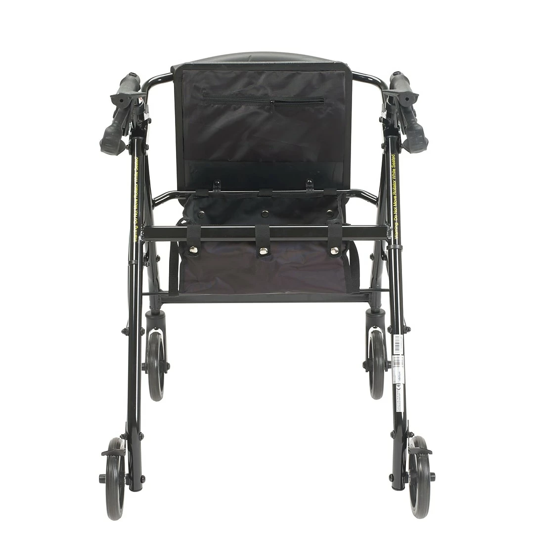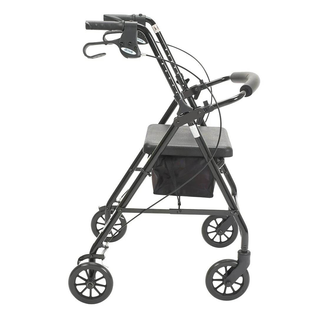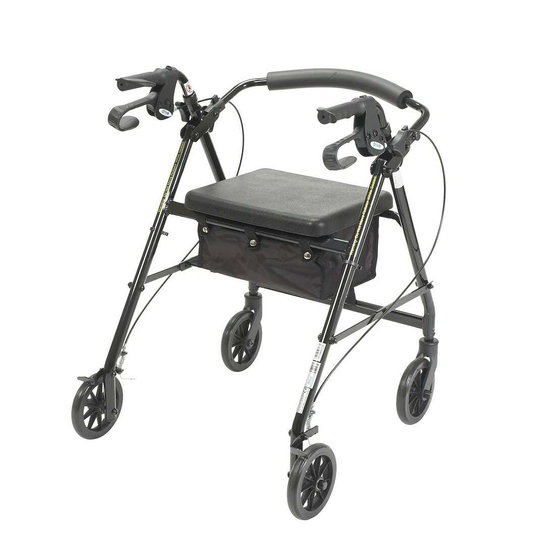 The Walker Rollator with 6″ Wheels, Fold Up Removable Back Support and Padded Seat in Black by Drive Medical comes standard with 6″ caster wheels, loop locks and serrated brakes to ensure safety. The seamless padded seat opens to a roomy, convenient, zippered storage pouch to easily and securely transport personal items, and the ergonomic handles are easy to grip, relieve hand pressure, and are height adjustable to accommodate users height. This Rollator by Drive Medical is a great value that provides the freedom of mobility. With a convenient seat for resting and loop locks that keep the Rollator from moving, you can be assured that this mobility aid will provide a safe and secure way to regain your active lifestyle.
