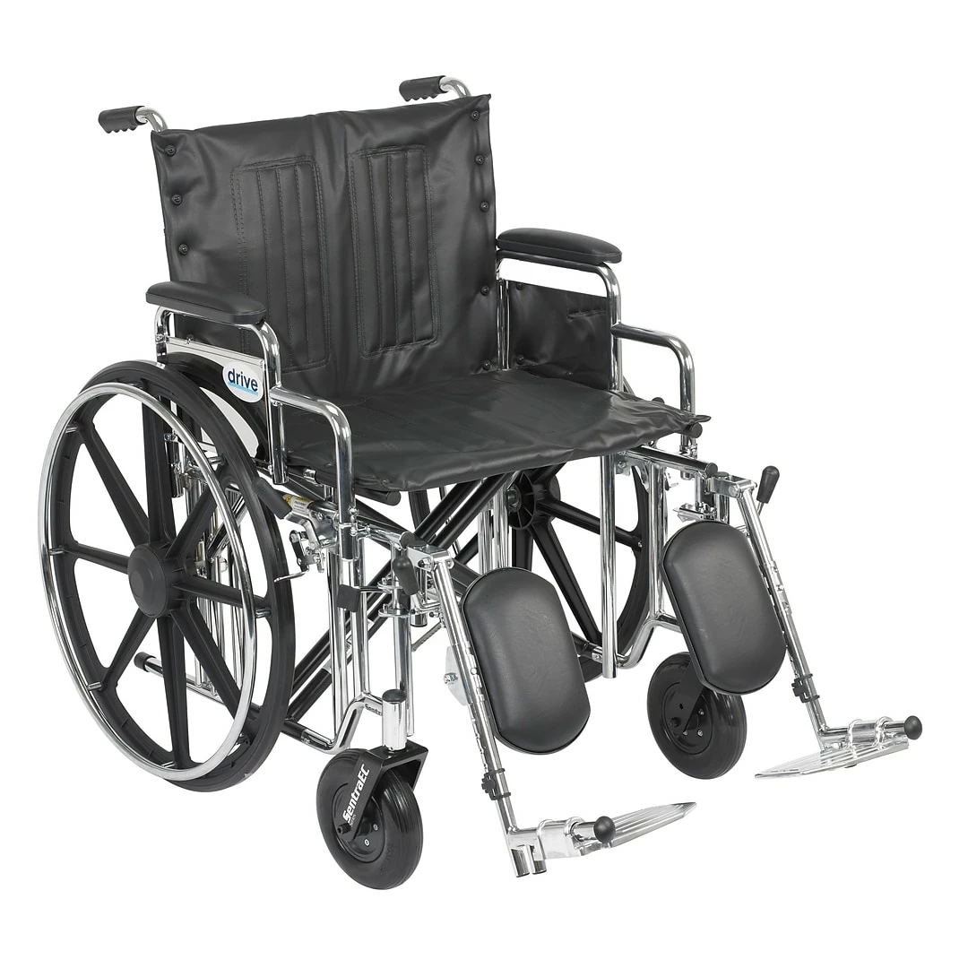 The Sentra Extra Heavy Duty Wheelchair from Drive Medical boasts a 500 pound weight capacity, made possible through the use of reinforced steel gussets, heavy gauge reinforced naugahyde upholstery, reinforced side frame, caster journals, and dual cross bars. The stylish triple coated chrome frame, made of carbon steel, adds a touch of elegance to this bariatric wheelchair. This Sentra Extra Heavy Duty Wheelchair comes with detachable desk arms, elevating leg rests, and a 22″ wide seat.