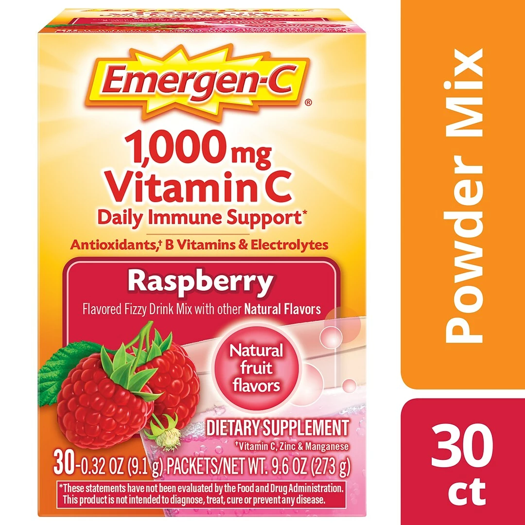 Includes 30 single-serving packets (0.32 oz. each) of Emergen-C Original Formula in Raspberry flavor