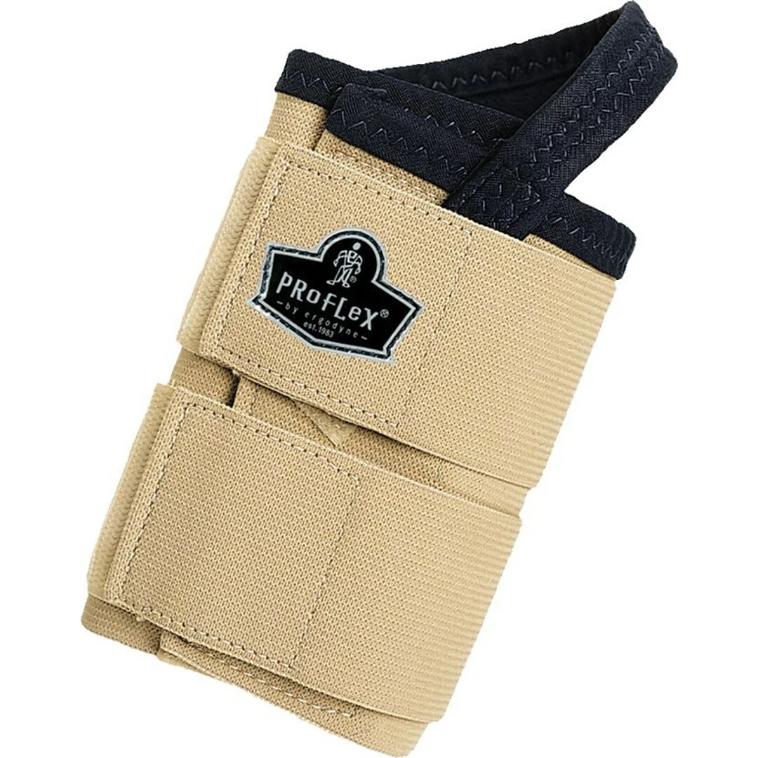 Ergodyne ProFlex 4010 Double Strap Tan Left Wrist Support has patented open-center stay with two-stage hook and loop closure.
