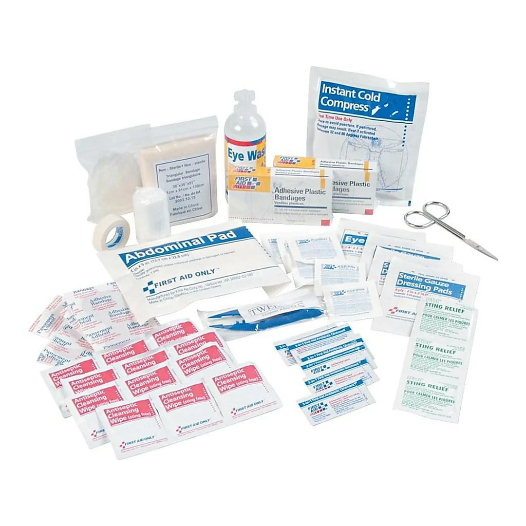 Contains: 50 (0.75″ x 3″) adhesive plastic bandages, 12 aspirin tablets, 12 BZK antiseptic towelettes, one (4″ x 5″) cold pack, one (2″) conforming gauze roll, and one (4 oz.) eyewash