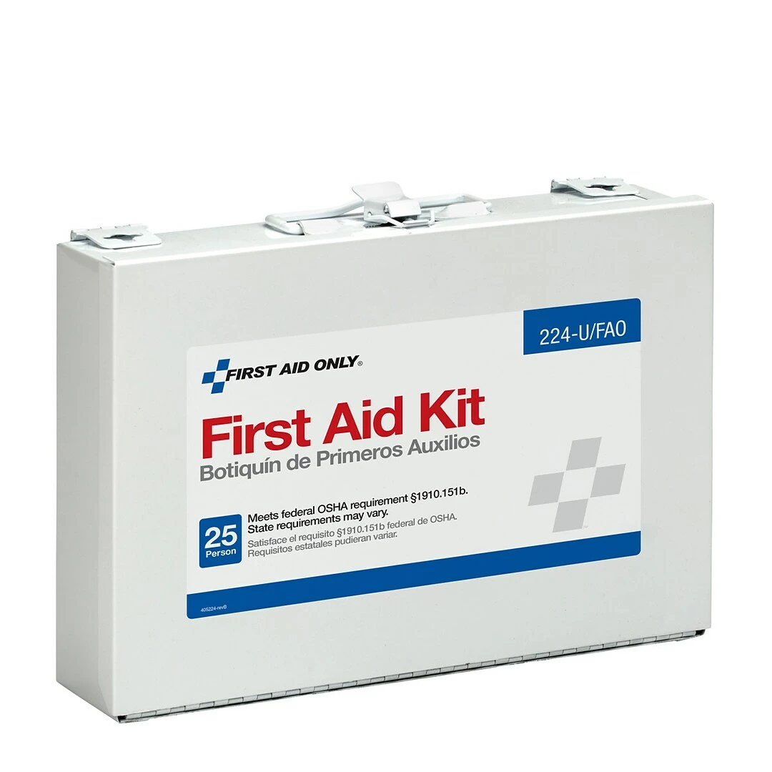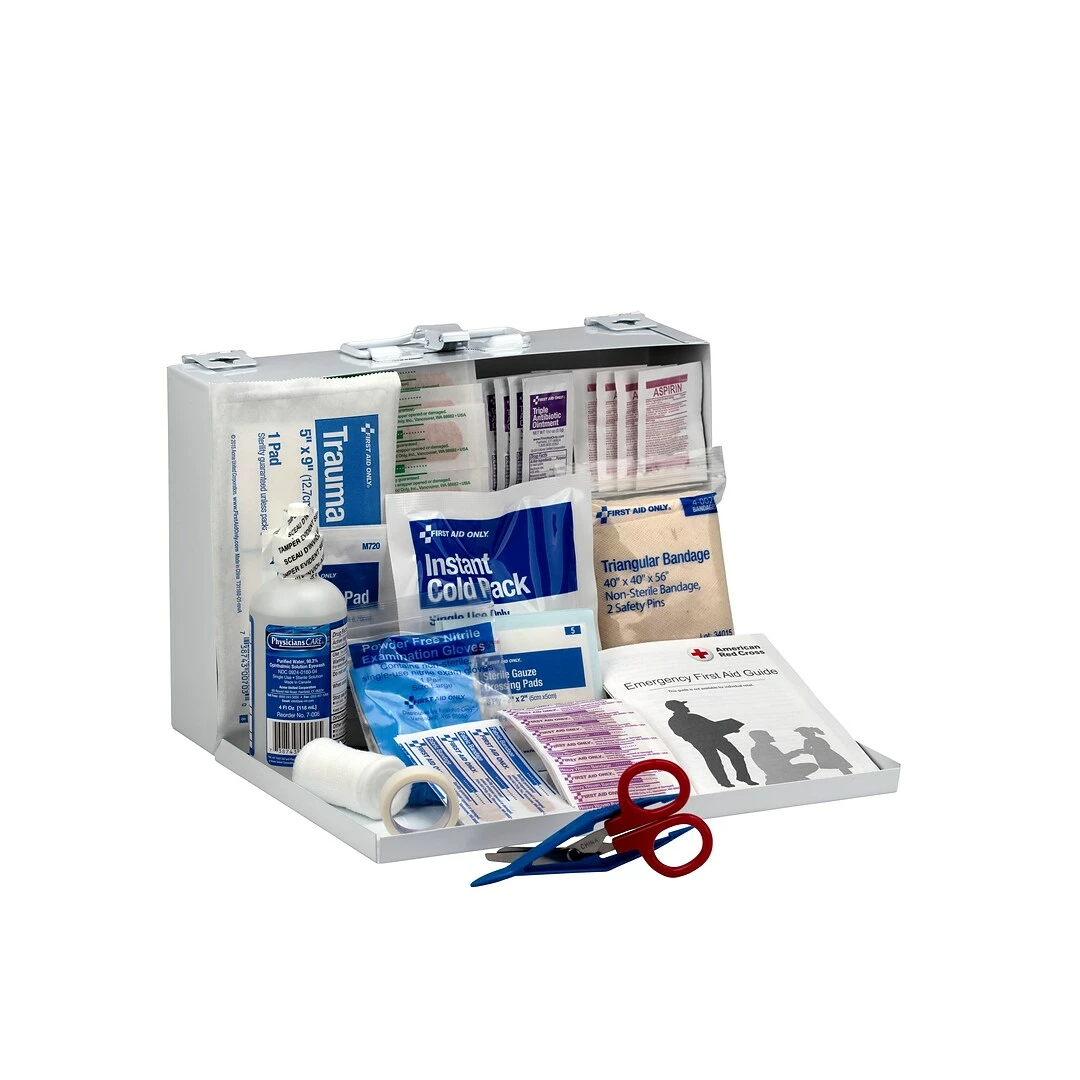 Treat minor injuries with this First Aid Only 25 person first aid kit. The durable metal case features a carrying handle for portability and a wall-mount design for permanent placement in your office. A handy first aid guide walks you through the steps needed to treat cuts, scrapes and burns. Use the gauze, scissors and bandages to dress wounds. Sting relief wipes, eyewash, a cold pack and aspirin tablets provide relief for a range of other injuries. Equipped with a wide assortment of supplies, this First Aid Only 25-person first aid kit provides convenient solutions for a wide range of workplace accidents and medical events.