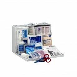 Contents Include: (50) Adhesive plastic bandages, 3/4″ x 3, (3) Large fingertip fabric bandages, (2) Knuckle fabric bandages, (1) Triangular sling/bandage, with 2 safety pins, 36, (3) Gauze dressing pads, 2″ x 2, (1) Conforming gauze roll bandage, 2, (1) Trauma pad, 5″ x 9, (1) Sterile eye pad, (12) BZK antiseptic towelettes, (6) Triple antibiotic ointment packs, (3) Insect sting relief pads, (1) Eye wash, 4 oz., (1) Instant cold compress, 4″ x 5, (12) Aspirin tablets, (6) 2-pks, (1) First aid tape roll, 1/2″ x 5 yard, (1) Scissors, 4-1/2″, nickel plated, (1) Tweezers, 4″, plastic, (2) Exam quality vinyl gloves, 1 pair, (1) First aid guide