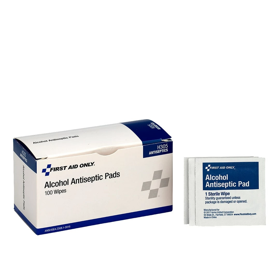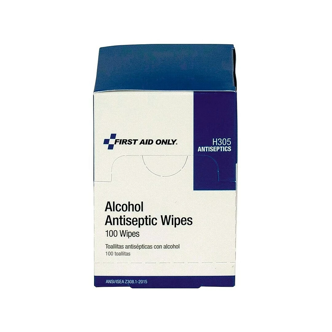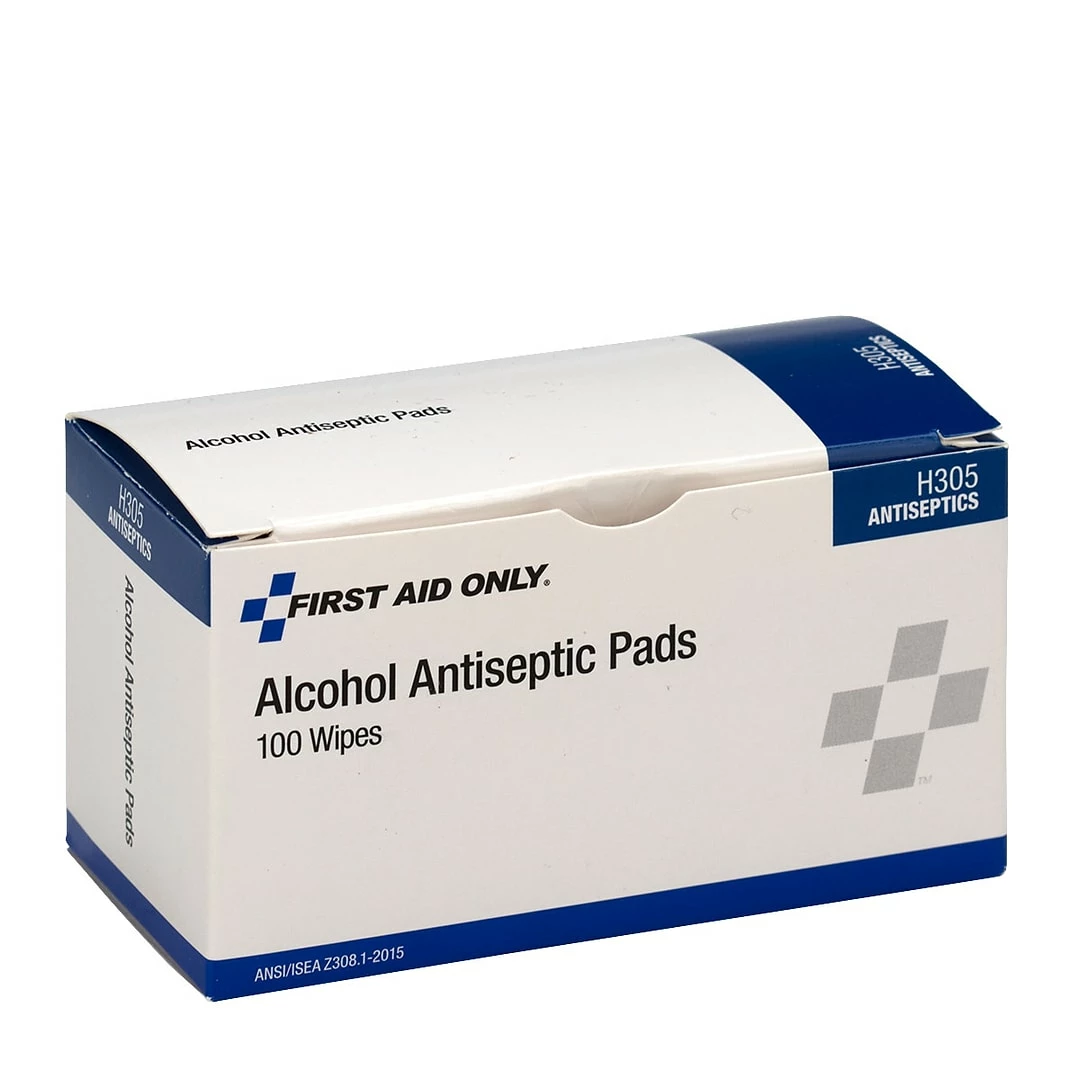 Sanitize minor scrapes, cuts and abrasions with these First Aid Only alcohol wipes. Each pad is saturated with 70% isopropyl alcohol, making it easy to prep the skin prior to injections. These single-use individually packaged First Aid Only alcohol wipes come 100 per box for easy restocking.