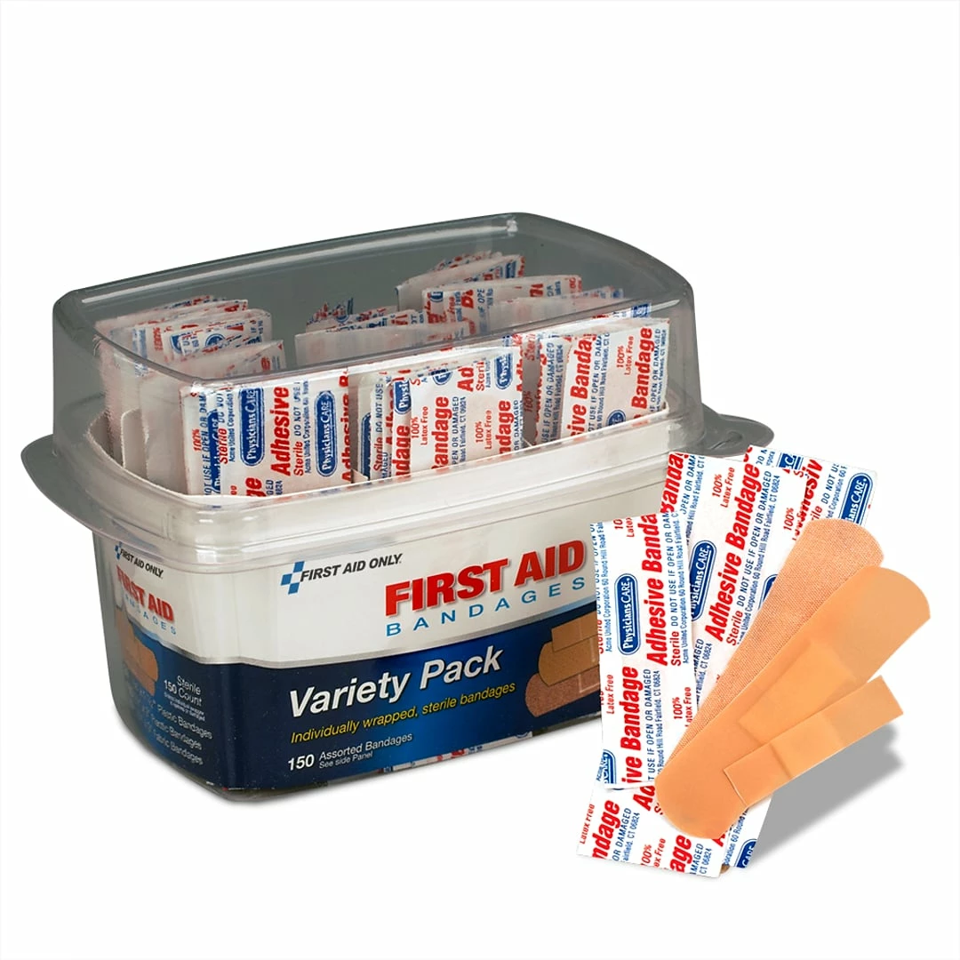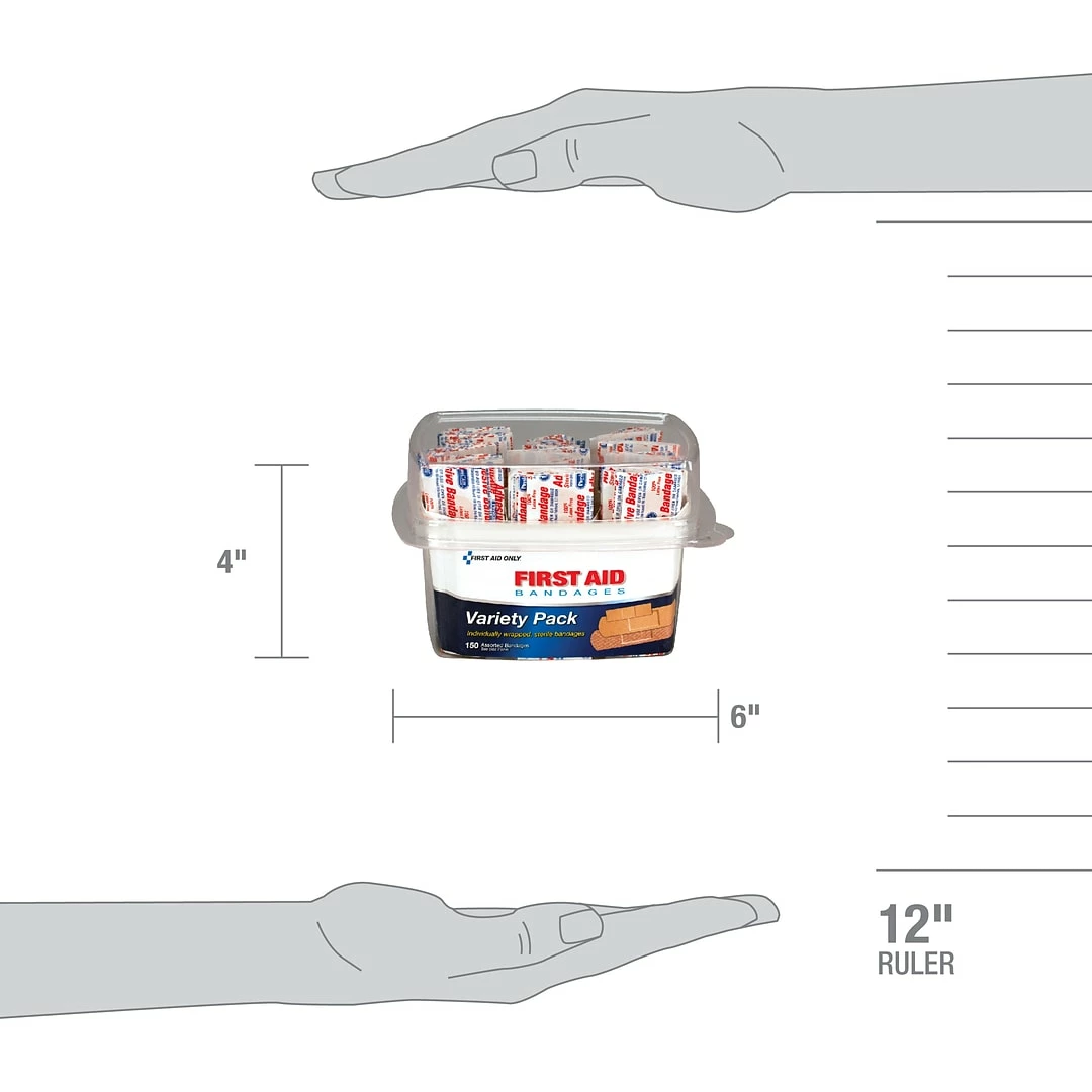Protect scrapes and cuts with each bandage in this 150-piece variety pack. Featuring three sizes of individually wrapped sterile bandages, this kit provides coverage for a variety of minor wounds. Each bandage in this First Aid Only bandage box kit is ventilated and includes a nonstick pad to absorb drainage, helping the natural healing process and speed up recovery.