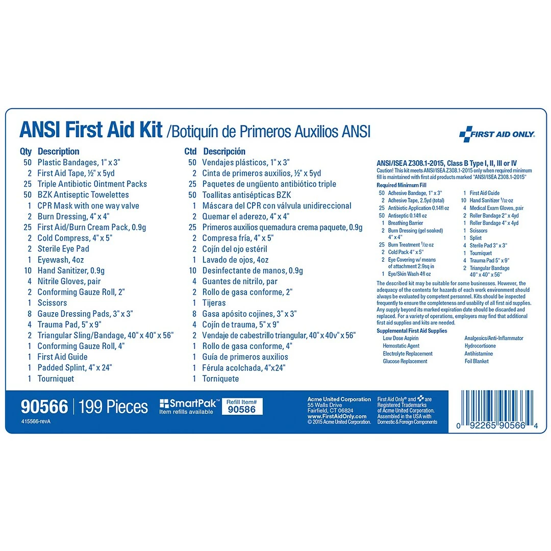 Kit contains: (50) Plastic Bandages, 1″ x 3″, (2) First Aid Tape, 1/2″ x 5yd, (25) Triple Antibiotic Ointment Packets, (50) BZK Antiseptic Towelettes, (1) CPR Mask with One Way Valve, (2) Burn Dressing, 4″ x 4″, (25) First Aid/Burn Cream Packets, 0.9g, (2) Cold Compress, 4″ x 5″, (2) Sterile Eye Pads, (1) Eyewash, 4oz, (10) Hand Sanitizer Packets, 0.9g, (8) Nitrile Gloves, (2) Conforming Gauze Roll, 2″, (1) Scissors, (8) Gauze Dressing Pads, 3″ x 3″, (4) Trauma Pads, 5″ x 9″, (2) Triangular Sling/Bandage, 40″ x 40″ x 56″, (1) Conforming Gauze Roll, 4″, (1) First Aid Guide, (1) Padded Splint, 4″ x 24″, (1) Tourniquet