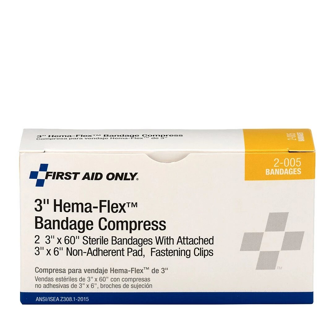 First Aid Only™ 3″ Compress bandage features off center and non stick surface that can be used as a wound pad. Compress bandage is wrapped to head or compressed over a wound, sold as 2 per box.