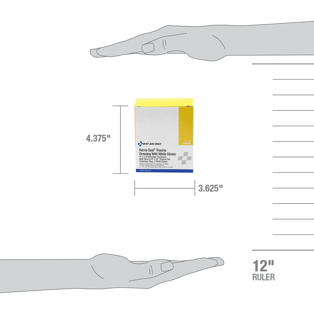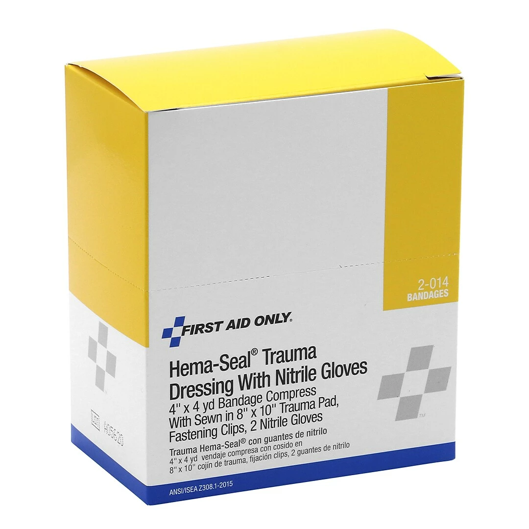 This First Aid Only refill supply features a 4″ x 4 Yd. Hema-Seal Trauma Dressing and 2 Nitrile Exam Gloves. This kit is perfect for a standalone first aid protection kit or as a refill for a BBP cleanup kit (sold separately). Contains trauma wound compress with fastening clips and 2 non-sterile single use powder-free nitrile examination gloves. Convenient to have for any emergency.