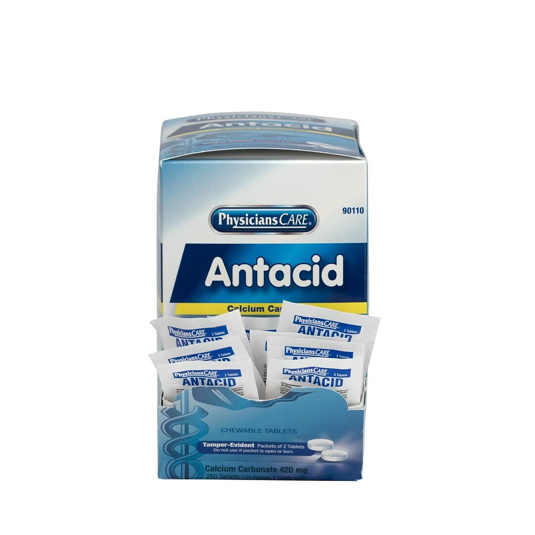 These PhysiciansCare Antacid packets are perfect for a standalone first aid or as a refill for a kit. The active ingredients are Calcium Carbonate 420 mg. The tablets are coated, easy to swallow, and gluten free.