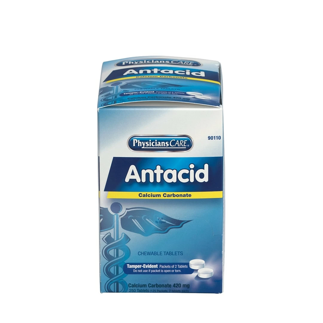 Keep your office stocked with these PhysiciansCare antacid tablets for access to indigestion treatment when needed. The convenient two-tablet packets take the guesswork out of choosing the right dosage, and each tablet is coated for easy swallowing. These antacids are sugar-free and contain calcium carbonate as the active ingredient, providing effective relief of heartburn and other related symptoms. With 125 packets in each box, these PhysiciansCare antacid tablets make an ideal addition to employee break rooms and kitchens.