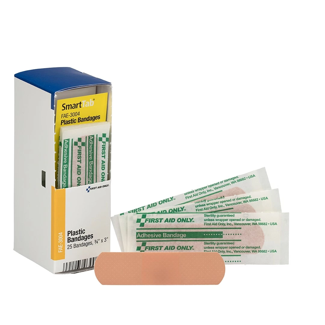 Treat cuts with these adhesive bandages. The ventilated natural fabric aids in faster healing of small wounds, while the flexible vinyl construction makes it possible to move the wounded area around freely once it’s bandaged. This refill box of First Aid Only of adhesive bandages has a reminder tab that appears when it’s time to get new bandages, making it easy to keep the medicine cabinet stocked.