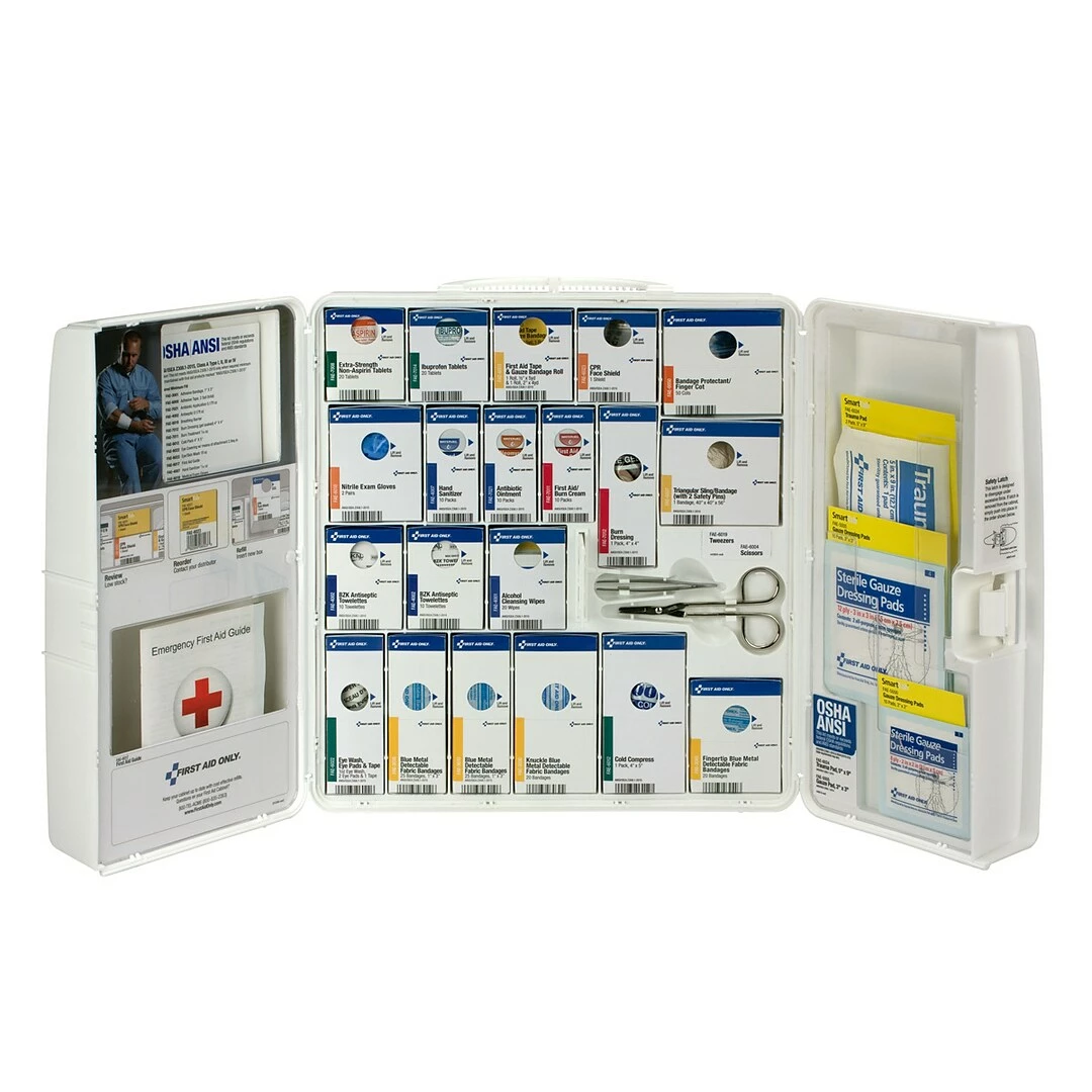 Content Includes: (1) 350001: First Aid Guide, (2) FAE-3010: Blue Metal Detectable Bandages, 1″x 3″, 25ct, (1) FAE-3030: Knuckle Blue Metal Detectable Bandages, 20ct, (1) FAE-3040: Fingertip Blue Metal Detectable Bandages, 20ct, (1) FAE-4001: Alcohol Wipes, 20ct, (2) FAE-4002: BZK Antiseptic Towelettes, 10ct, (1) FAE-4007: Hand Sanitizer Packets, 10ct, (1) FAE-5000: Sterile Gauze Pads, 2″ x 2″, 10ct, (1) FAE-5005: Sterile Gauze Pads, 3″ x 3″, 10ct, (1) FAE-6003: First Aid Tape, ½” x 5yd and Gauze Roll, 2″ x 4yd, (1) FAE-6007: Triangular Bandage, 40″ x 40″ x 56″, (1) FAE-6012: Cold Pack, 4″ x 5″, (1) FAE-6018: Nitrile Exam Gloves, 4 count, (1) FAE-6022: 2 Sterile Eye pads, 1oz Eyewash, ½” x 5 yd. Tape Roll, (1) FAE-6023: CPR Mask, (1) FAE-6024: Trauma Pads, 5″ x 9″, 2ct, (1) FAE-6050: Finger Cots, 50ct, (1) FAE-7008: Non-Aspirin Tablets, 20ct, (1) FAE-7011: Burn Cream Packets, 10ct, (1) FAE-7012: Burn Dressing, 4″ x 4″, (1) FAE-7014: Ibuprofen Tablets, 20ct, (1) FAE-7021: Antibiotic Ointment Packets, 10ct, (1) M5090: Forceps, (1) M582: Scissors
