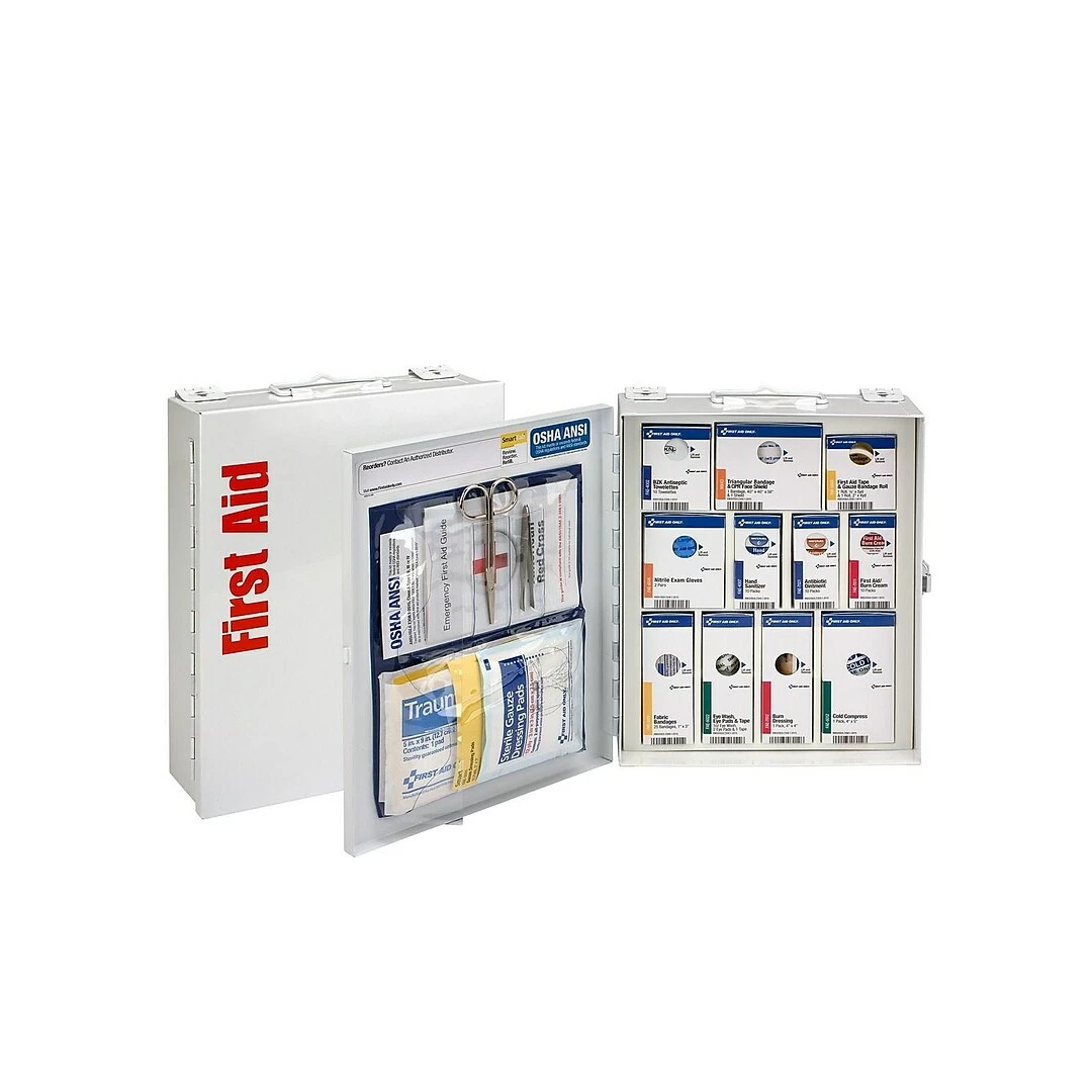 Kit contains: (1) 90643: 1 Triangular Bandage & 1 CPR Mask, (1) 350001: First Aid Guide, (1) FAE-3001: Adhesive Fabric Bandages, 1″ x 3″, 25ct, (1) FAE-4002: BZK Antiseptic Towelettes, 10ct, (1) FAE-4007: Hand Sanitizer Packets, 10ct, (1) FAE-5005: Sterile Gauze Pads, 3″ x 3″, 10ct, (1) FAE-5012: Trauma Pads, 5″ x 9″, 2ct, (1) FAE-6012: Cold Pack, 4″ x 5″, (1) FAE-6018: Nitrile Exam Gloves, 4 count, (1) FAE-6022: 2 Sterile Eye pads, 1 oz. , Eyewash, 1/2″ x 5 yd. Tape Roll, (1) FAE-6024: First Aid Tape, 1/2″ x 5yd and Gauze Roll, 2″ x 4yd, (1) FAE-7011: Burn Cream Packets, 10ct, (1) FAE-7012: Burn Dressing, 4″ x 4″, (1) FAE-7021: Antibiotic Ointment Packets, 10ct, (1) M5090: Forceps, (1) M582: Scissors