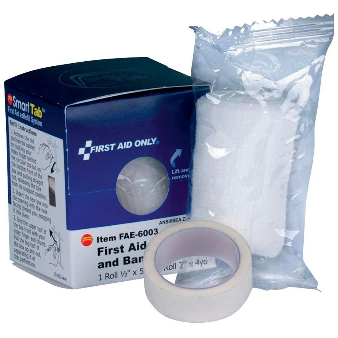 Refill box for first aid kits: Box contains one each of: 1/2″ x 5 yd. tape and 2″ x 4 yd. Gauze Roll