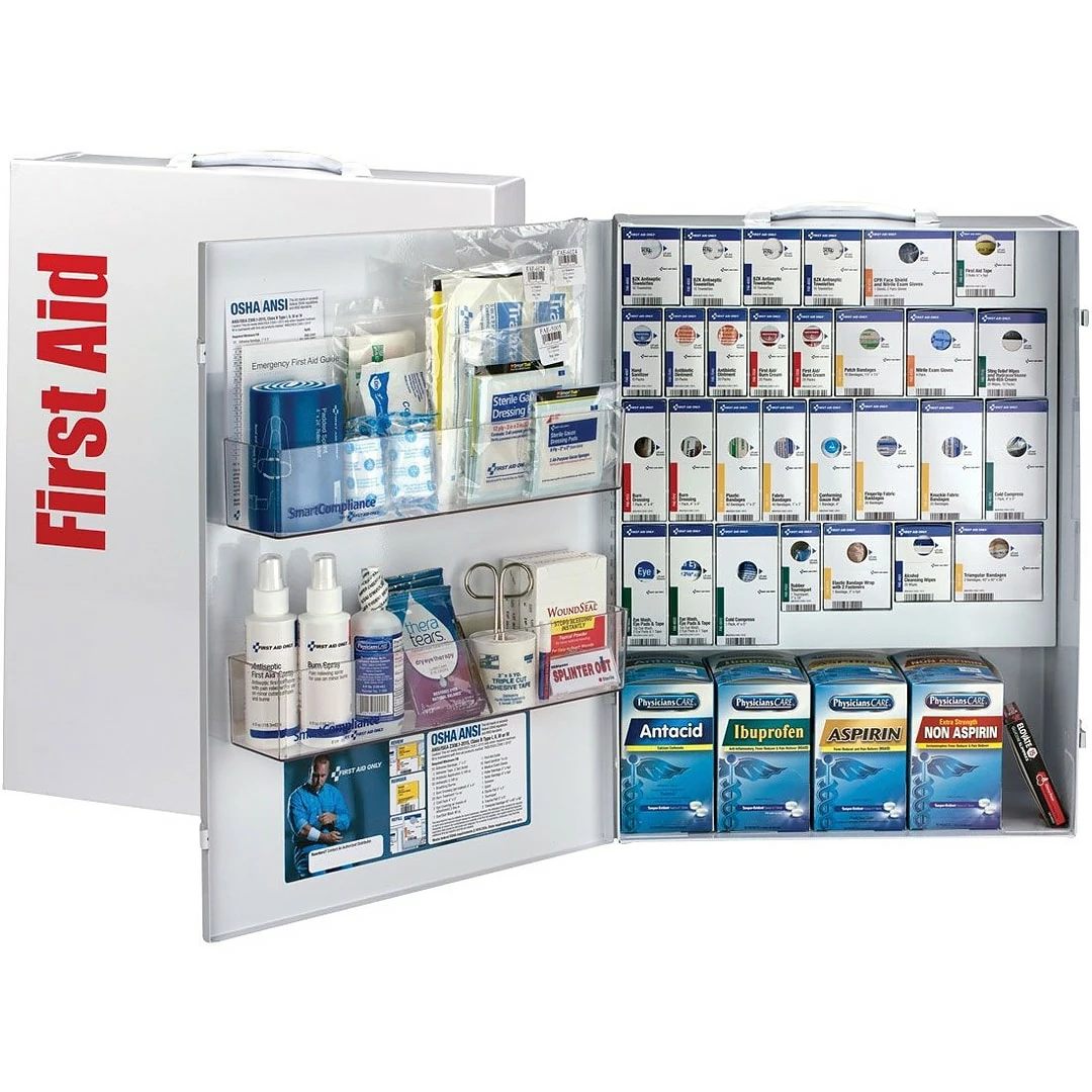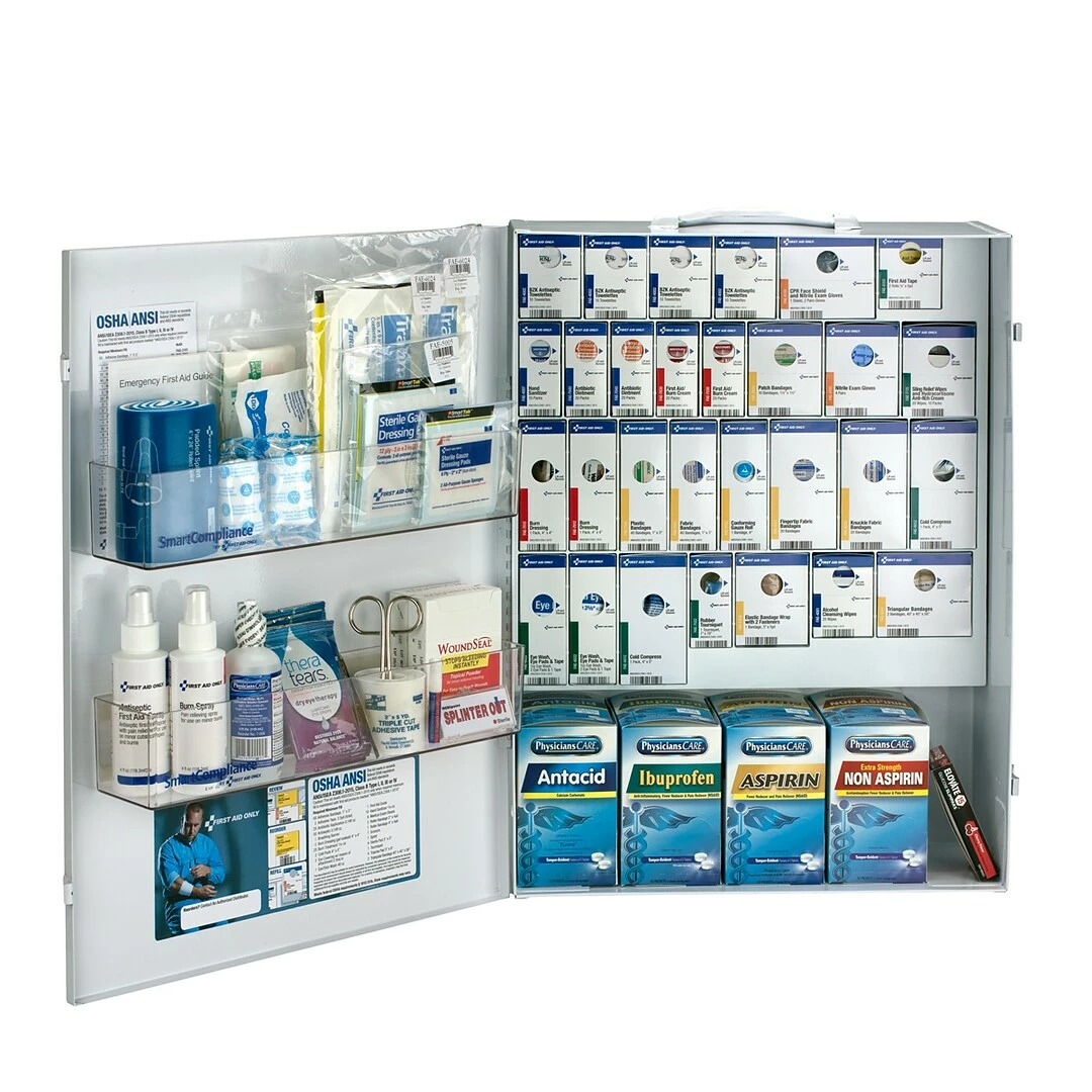 This XL SmartCompliance Cabinet has more of what you need and organized for reordering ease. Higher piece counts on items, more variety to meet your needs and color coded packaging helps you find items faster. The Visual Smart Tab with ezRefill reminder tabs make it easy to monitor and reorder your supplies. The part number and barcodes are located behind each box for easy reordering. The bottom shelf and door shelves also allow you to customize to meet your specific needs. Contents exceed the 2015 ANSI Class B requirements and are sufficient to treat 150 or more people.