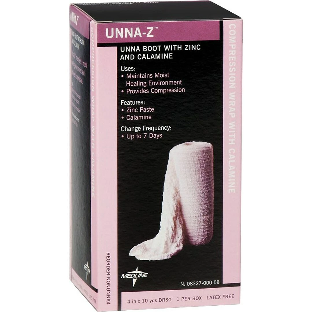 Calamine unna boot bandages are impregnated with zinc oxide and calamine. Inner Plastic core for easy application. Can be left in place for up to 7 days, depending on drainage. Contraindicated for patients known sensitivity to zinc and/or calamine.