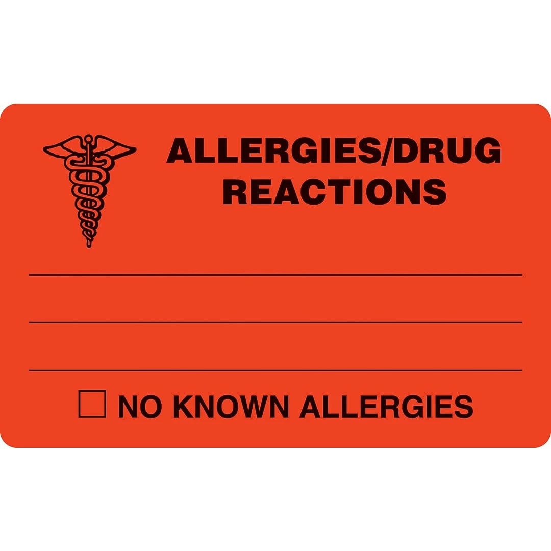Allergy warning labels help improve patient care and serve as an alert to all staff, informing them of patient information 100 Fluorescent Red “Allergies/Drug Reactions” labels per package