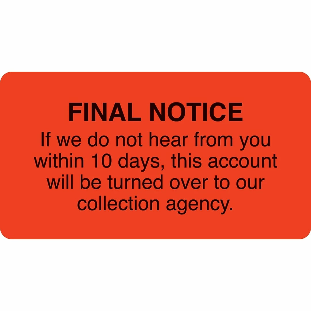 Fluorescent Red “Final Notice – 10 days” label gets results from problem accounts Reduce staff time spent on collection efforts and improve cash flow