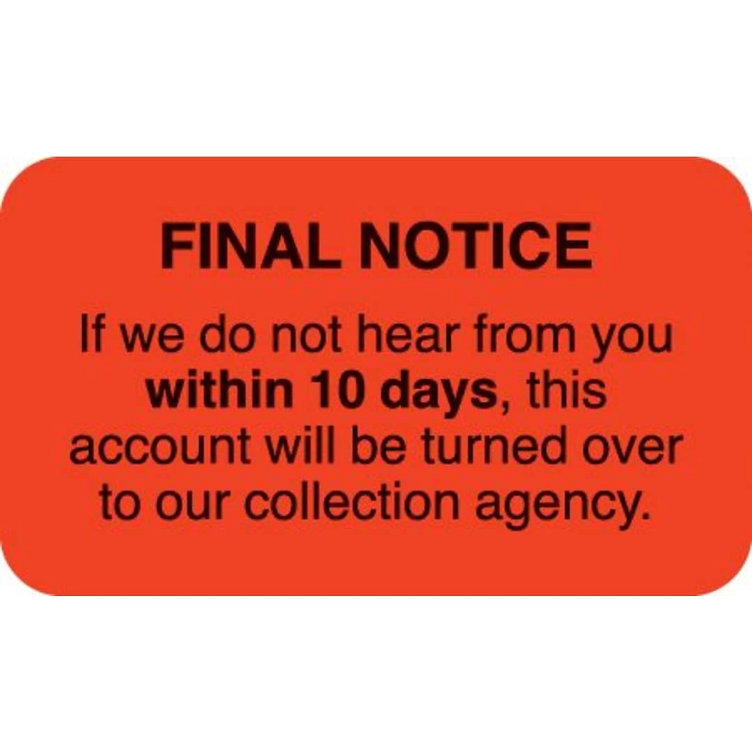 Hard-hitting message gets results from problem accounts and helps reduce staff time spent on collections 500 Fluorescent Red “Final Notice” labels per roll