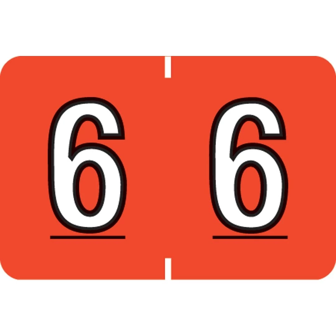 Color-coded numeric labels to match Colwell Jewel Tone Systems. Clear laminate protects labels. Scored with self-adhesive backing for easy application. Numeric 6; salmon color. 500 labels per roll in self-dispensing box. Label size: 1-1/2″ x 1″.