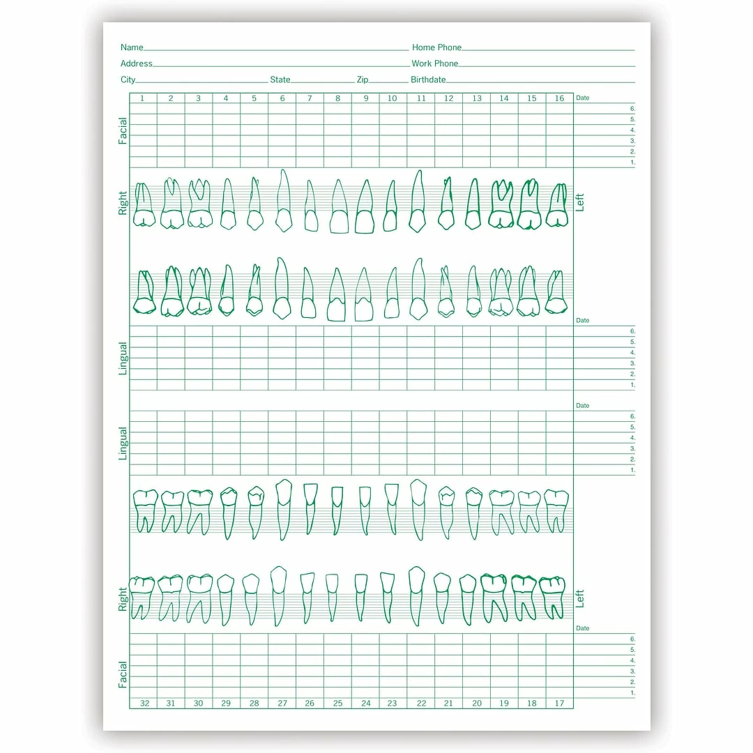 Helps you accurately record conditions during each appointment. Features tooth illustrations and room to record up to 6 visits. Charting instructions and room for clinical evaluation on back. Printed in green ink on 24-lb. ledger stock. 250 per package. Size: 8-1/2 x 11″.