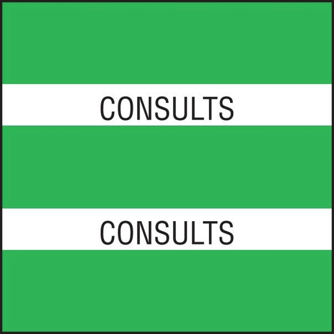 Double bands of Light Green and “Consults” title appear on both sides. Scored for easy application. Permanent adhesive backing with laminated mylar coating. Use with Dividers 20256 and 20257. 102 tabs per package. Size: 1-1/2″ x 1-1/2″ (before folding).