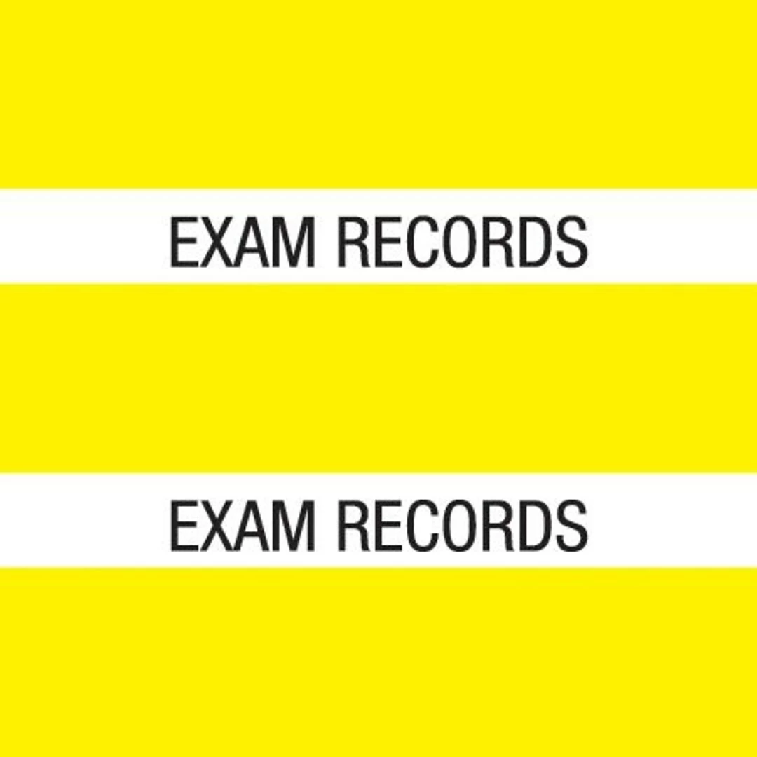 Double bands of Yellow and “EXAM RECORDS” title appear on both sides. Scored for easy application. Permanent adhesive backing with laminated mylar coating. Use with Dividers 20256 and 20257. 102 tabs per package. Size: 1-1/2″ x 1-1/2″ (before folding).