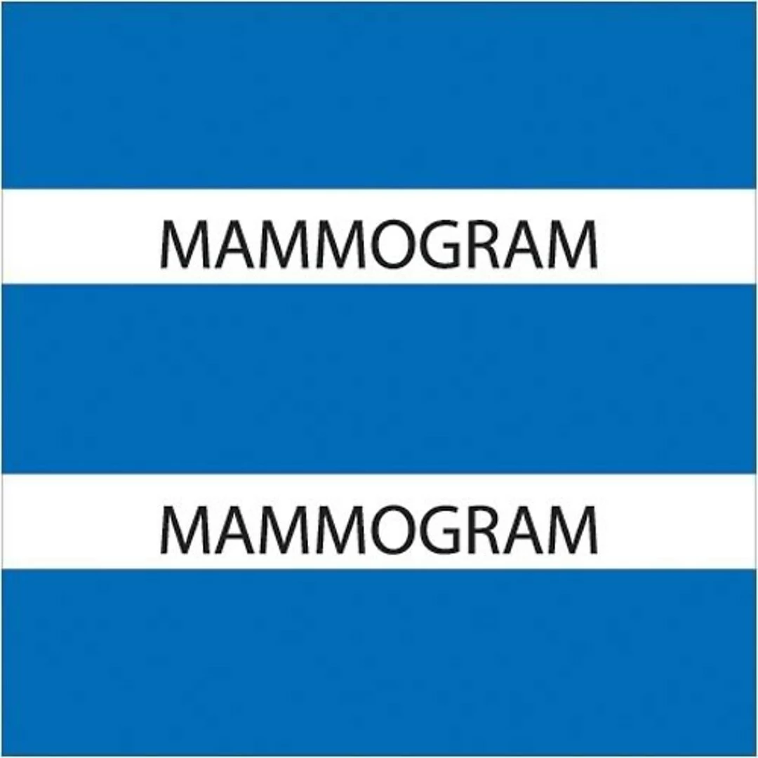 Double bands of Dark Blue and “Mammogram” title appear on both sides. Scored for easy application. Permanent adhesive backing with laminated mylar coating. Use with Dividers 20256 and 20257. 102 tabs per package. Size: 1-1/2″ x 1-1/2″ (before folding).