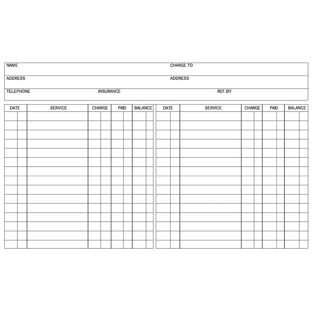 Compact twin entry ledger card to record services rendered, charges, amount paid and balance. Printed on 2 sides in black ink on heavy-duty 110-lb. white card stock. Size: 5×8″.