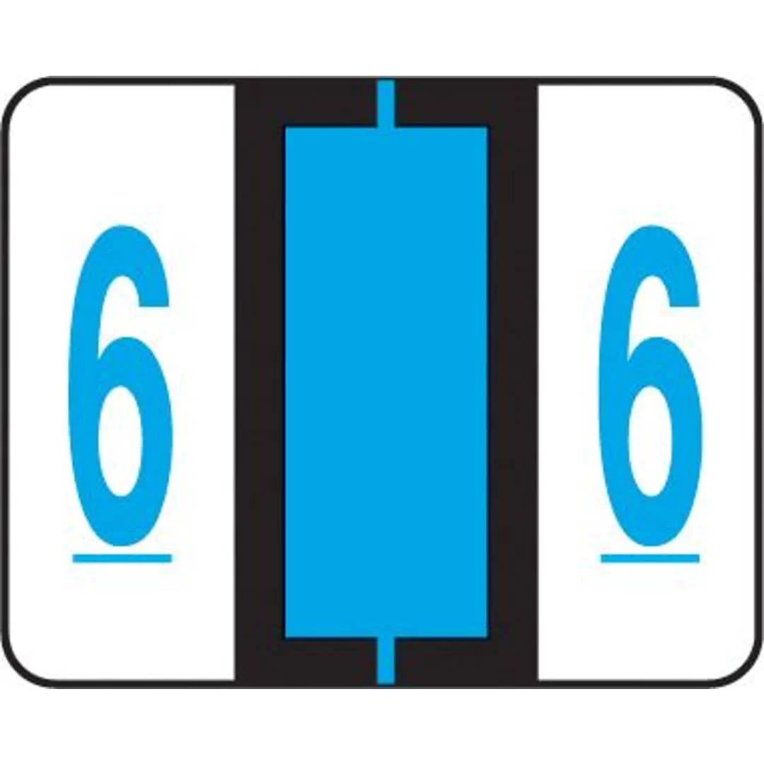 Compatible with TAB® Products labels – same design, same color – but you pay less! Labels are scored and self-adhesive with clear laminate finish. 500 Blue “6” labels per roll in a self-dispensing box. Label size: 1-1/4″W x 1″H before folding.