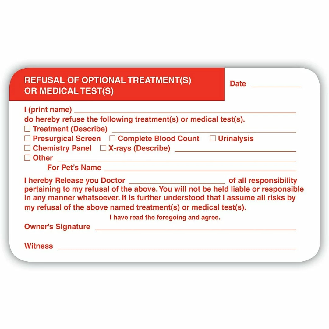 | Color Family : White | Customizable : No | Exact Message : Refusal of optional treatment or medical test | Label Height in Inches : 2-1/2″ |