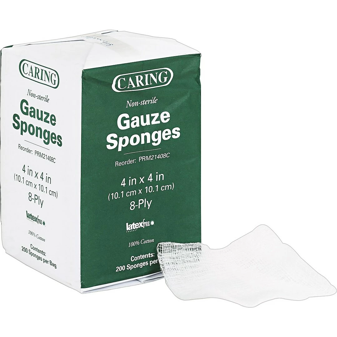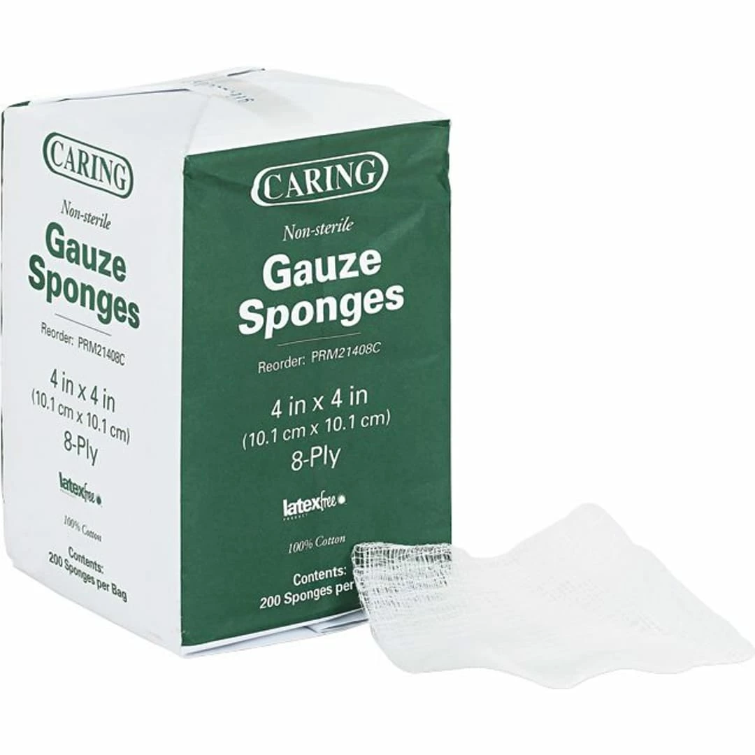 Caring Woven gauze sponge is ideal for wound debriding, prepping, packing, dressing and general wound care. 4 x 4 Gauze sponge is a non-sterile pad with 8 ply yarn cotton, sold as 200 per pack.