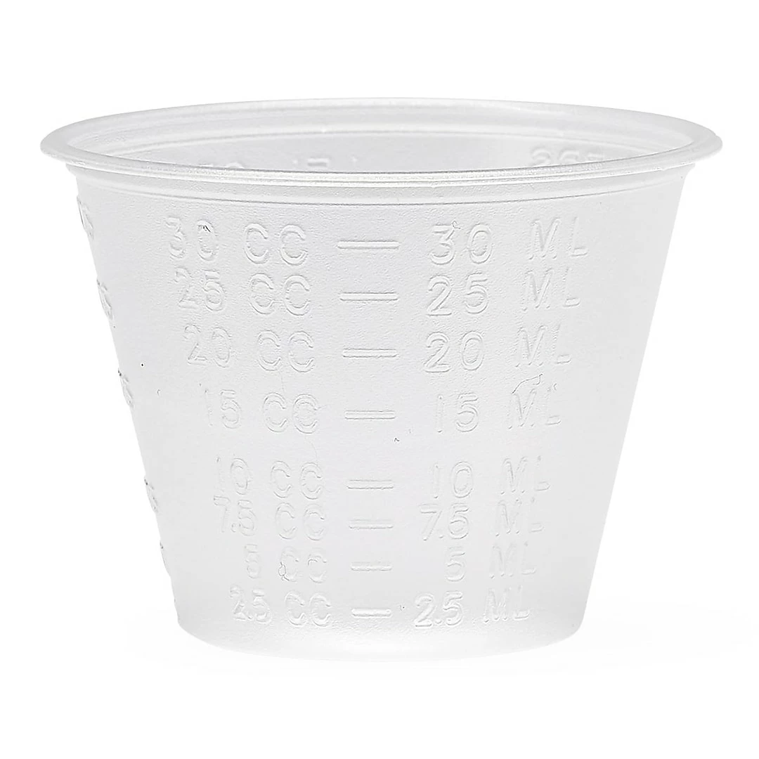 Medicine cups are calibrated from 1-8 drams, 1/8-1 fluid ounce, 1-2 tablespoon and 2.5-30mL and cc.
