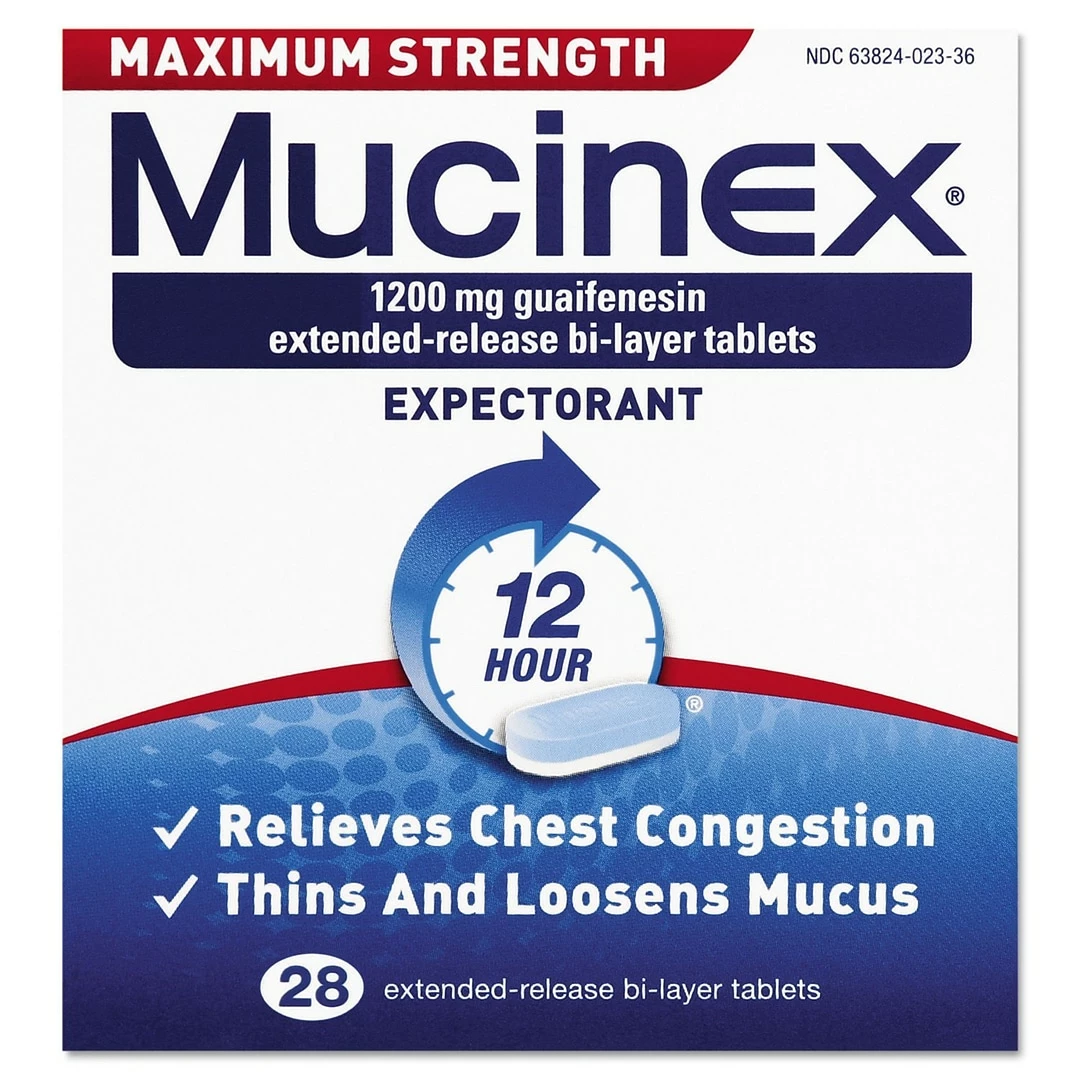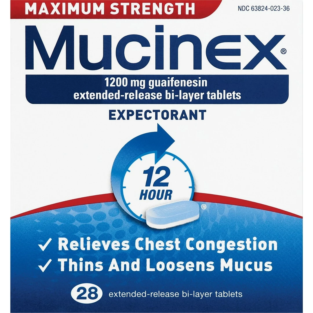 Mucinex® Max Strength extended-release bi-layer tablet helps to loosen phlegm and thin bronchial secretions to get rid of mucus or cough. Tablet start to work right away and is ideal for age group of 12 years or up, sold as 28 per pack.
